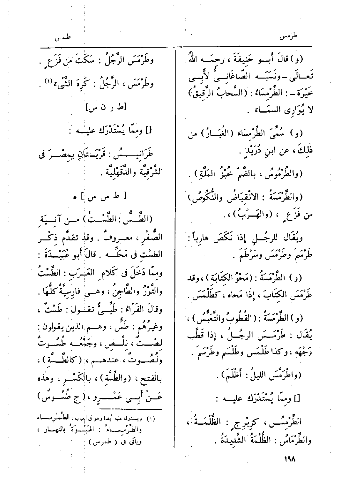 وَقَالَ أَبو حنِيفَةَ، رحِمَه اللهُ تَعالَى ونَسَبَه الصّاغَانِيُّ لأَبِي خَيْرَه: الطِّرْمِسَاءُ: السَّحابُ الرَّقِيقُ لَا يُوَارِي السمَاءَ. سُمِّيَ الطِّرْمِسَاءَ الغُبَارُ من ذلِكَ، عَن ابنِ دُرَيْدٍ. والطُرْمُوسُ، بالضَّمِّ خُبْزُ المَلَّةِ. والطَّرْمَسَةُ: الانْقِبَاضُ والنُّكُوصُ من فَزَعٍ، والهَرَبُ، ويُقَال للرجُلِ إِذا نَكَصَ هارِباً: طَرْسَمَ وطَرْمَسَ وسَرْطَمَ. والطَّرْمَسَةُ: مَحْوُ الكِتَابَةِ، وَقد طَرْمَسَ الكِتَابِ، إِذا مَحاه، كطَلْمَس.