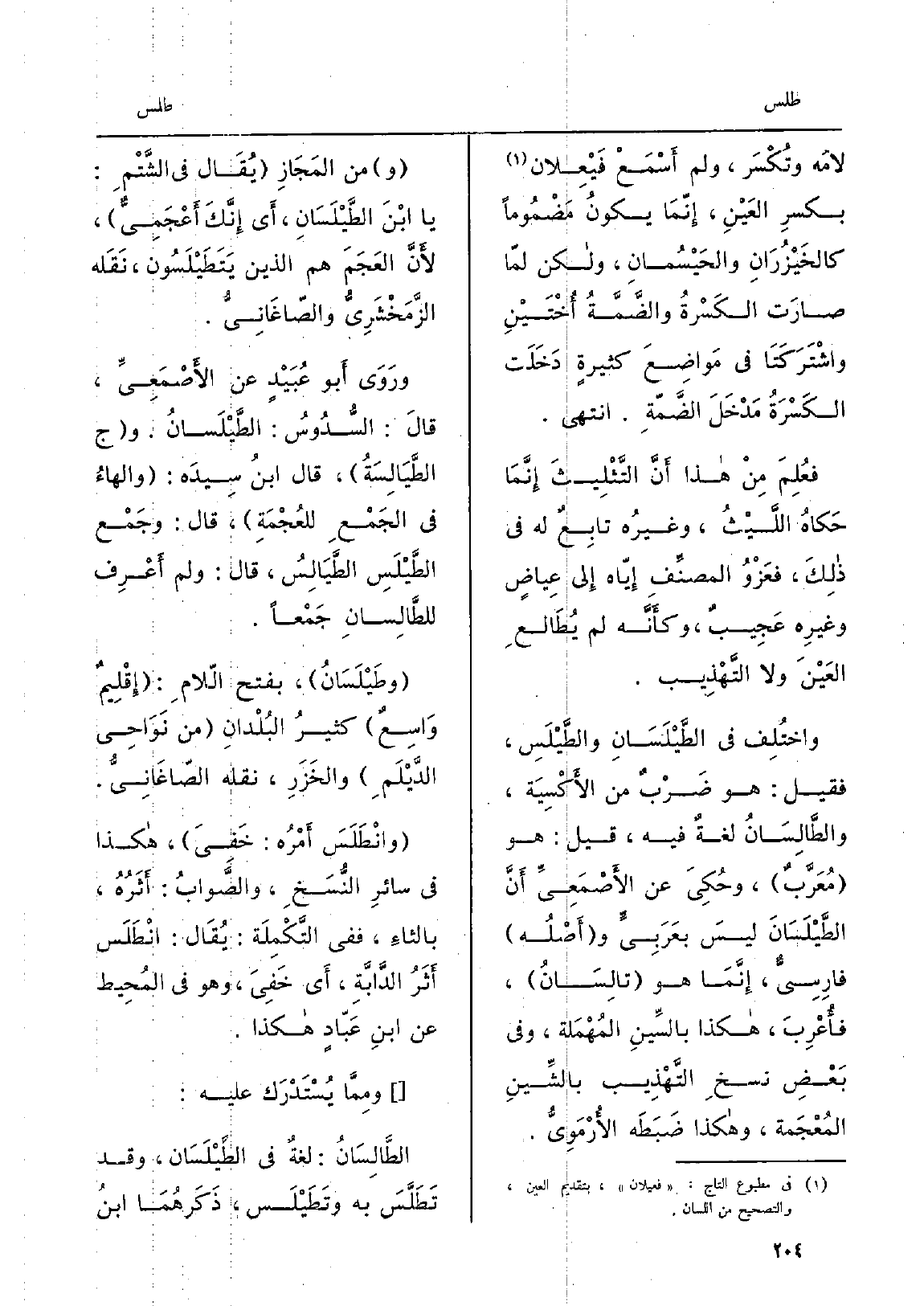 لامه وتُكْسَر، وَلم أَسْمَعْ فَيْعِلان بكسرِ العَيْنِ، إِنّمَا يكونُ مَضْمُوماً كالخَيْزُرَانِ والحَيْسُمانِ، وَلَكِن لمّا صارَت الكَسْرةُ والضَّمَّةُ أَخْتَيْنِ واشْتَرَكَتَا فِي مَواضِعَ كثيرةٍ دَخَلَت الكَسْرَةُ مُدْخَلَ الضَّمَّةِ. انْتهى. فعُلِمَ مِنْ هَذَا أَنَّ التَّثْلِيثَ إنَّمَا حَكاهُ الَّليْثُ، وغيرُه تابِعٌ لَهُ فِي ذلِكَ، فعَزْوُ المصنِّفِ إِيّاه إِلَى عِياضٍ وغيرِه عَجِيبٌ، وكأَنَّه لم يُطَالعِ العَيْنَ وَلَا التَّهْذيب. واختُلِفَ فِي الطَّيْلَسَانِ والطَّيْلَسِ، فَقيل: هُوَ ضَرْبُ من الأَكْسِيَة، والطَّالِسَانُ لغةٌ فِيهِ، قيل: هُوَ مُعَرَّبُ، وحُكِيَ عَن الأَصْمَعِيِّ أَنَّ الطًّيْلَسَانَ ليسَ بعَرَبِيِّ وأَصْلُه فارِسِيِّ، إِنَّمَا هُوَ تالِسَانُ، فأُعْرِبَ، هَكَذَا بالسِّينِ المُهْمَلة، وَفِي بَعْضِ نسخِ التَّهْذِيب بالشِّينِ المُعْجَمة، وَهَكَذَا ضَبَطَه الأُرْمَوِيُّ. وَمن المَجَازِ يُقَال فِي الشَّتْمِ: يَا ابْنُ الطَّيْلَسَانِ، أَي إِنَّك أَعْجَمِيُّ، لأَنَّ العَجَمَ هم الَّذين يَتَطَيْلَسُون، نَقَله الزَّمَخْشَرِيُّ والصّاغَانِيُّ.
