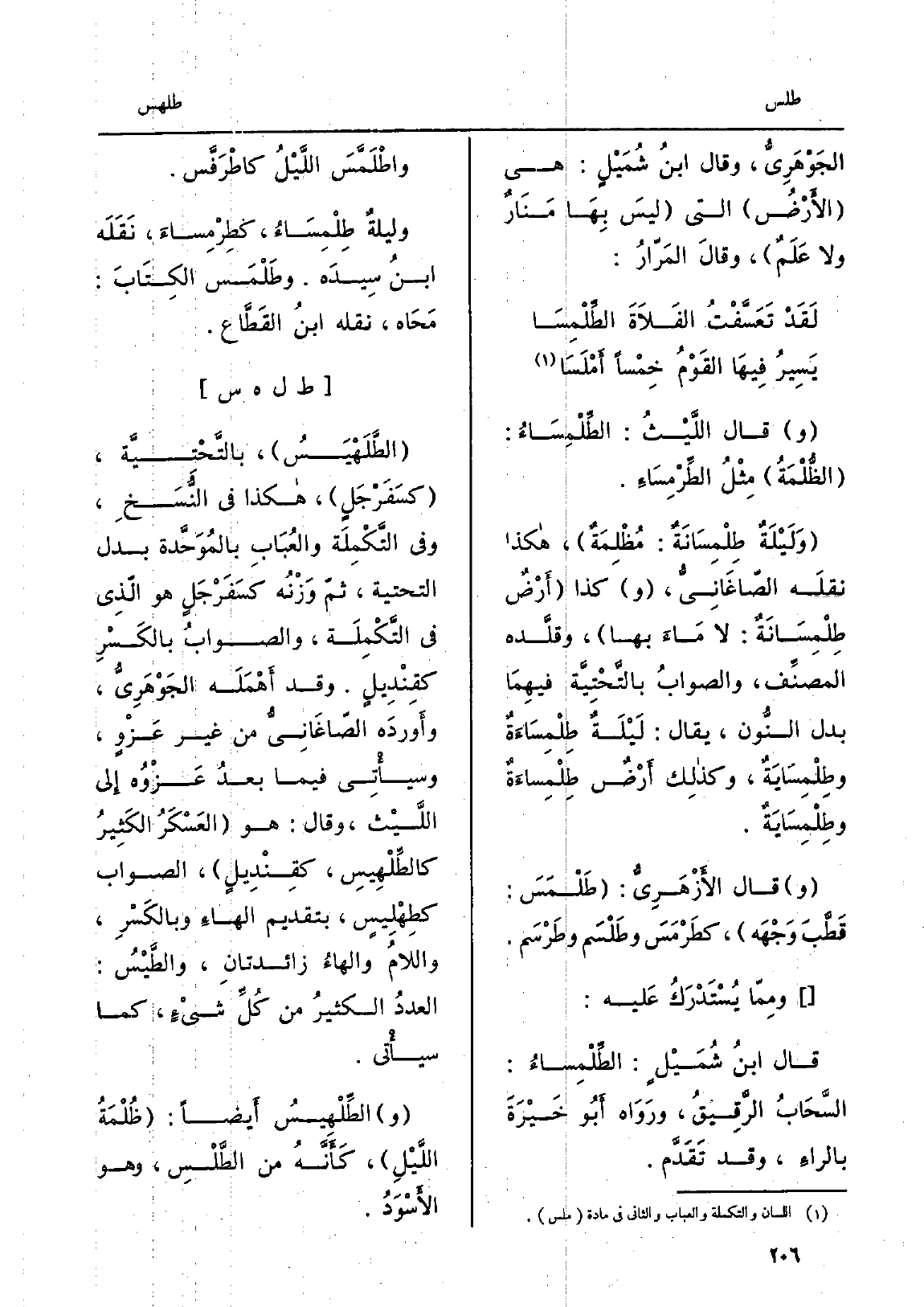 وَقَالَ اللَّيْثُ: الطِّلْمِسَاءُ: الظُّلْمَةُ مِثْلُ الطِّرْمِسَاءِ. وَلَيْلَةٌ طِلْمِسَانَةٌ: مُظْلِمَةٌ، هَكَذَا نقلَه الصّاغَانِيُّ، وَكَذَا أَرْضُ طِلْمِسَانَةٌ: لَا ماءَ بهَا، وقلَّده المصنِّف، والصّوابُ بالتَّحْتِيّة فيهِمَا بدل النُّون، يُقَال: لَيْلَةٌ طِلْمِسَاءَةٌ وطِلْمِسَايَةٌ، وكذلِك أَرْضٌ طِلْمِساءَةٌ وطِلْمِسَايَةٌ. وَقَالَ الأَزهَرِيُّ: طَلْمَسَ: قَطَّبَ وَجْهَه، كطَرْمَسَ وطَلْسَم وطَرْسَم. ومِمّا يُسْتَدْرَكُ عَليه: قَالَ ابنُ شُمَيْلٍ: الطِّلْمِساءُ: السَّحَابُ الرَّقِيقُ، ورَوَاه أَبُو خَيْرَةَ بالرَّاءُِ، وَقد تَقَدَّم. واطْلَمَّسَ اللَّيْلُ كاطْرَفَّس. وليلةٌ طِلْمِسَاءُ، كطِرْمِساءَ، نَقَلَه ابنُ سِيدَه. وطَلْمَس الكِتَابَ: مَحَاه، نَقله ابنُ القَطَّاع.