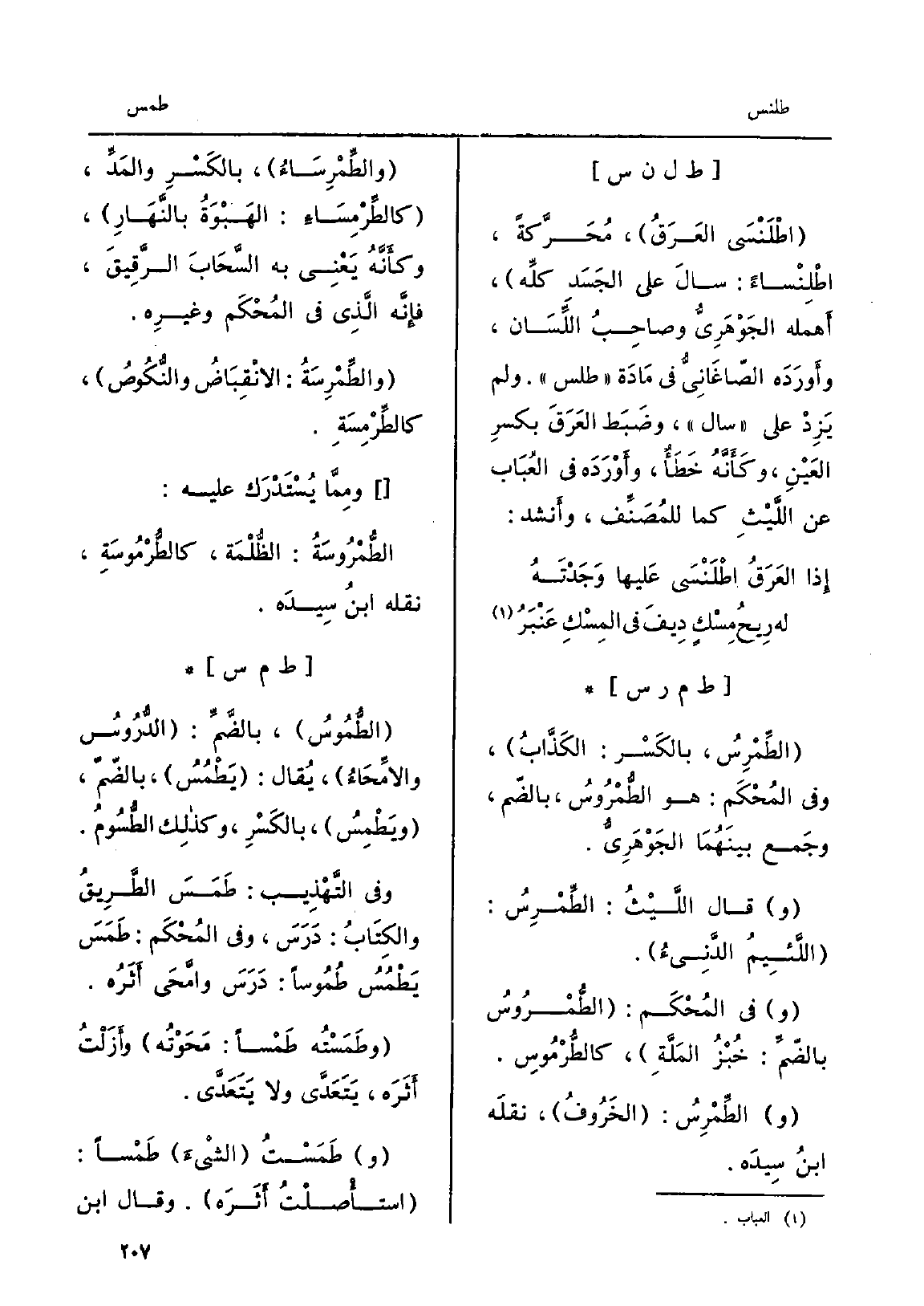 الطُّمُوسُ، بالضَّمِّ: الدُّرُوسُ والمِّحَاءُ، يُقال: يَطْمُسُ، بالضَّمّ، ويَطْمِسُ، بالكضسْرِ، وكذلِك الطُّسُومُ. وَفِي التَّهْذِيب: طَمَسَ الطّرِيقُ والكِتَابُ: دَرَسٍ، وَفِي المُحْكَم: طَمَسَ يَطْمُسُ طُمُوساً: دَرَسَ وامَّحَى أَثَرُه. وطَمَسْتُه طَمْساً: مَحَوْتُه وأَزَلْتُ أَثَرَه، يَتَعَدَّى وَلَا يَتَعَدَّى. وطَمَسْتُ الشْيءَ طَمْساً: استأْصَلْتُ أَثَرَه.