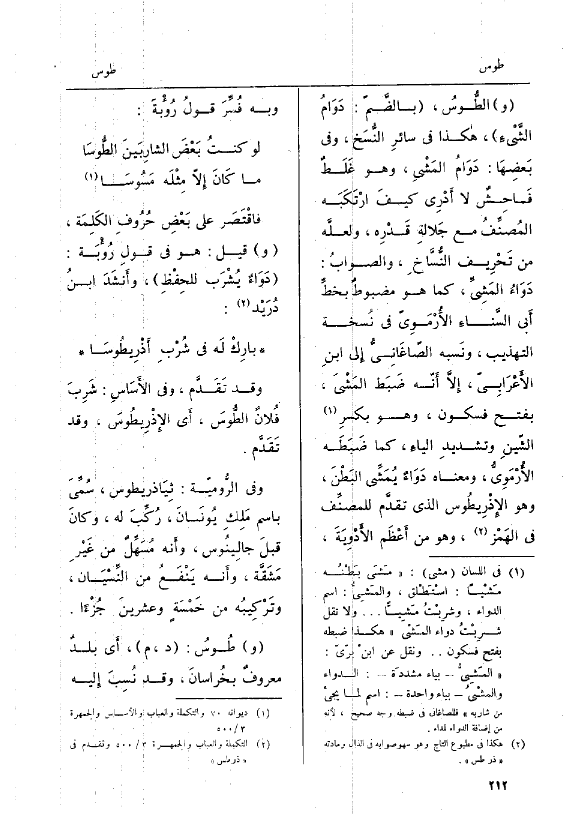 فاقْتَصَر على بَعْضِ حُرُوفِ الكَلِمَة، وَقيل: هُوَ فِي قولِ رؤْبَة: دَوَاءٌ يُشْرَب للحِفْظِ، وأَنشَدَ ابنُ دُرَيْد: بارِكْ لَه فِي شُرْبِ أَذْرِيطُوسَا وَقد تَقَدَّم، وَفِي الأَسَاسِ: شَرِبَ فُلانٌ {الطُّوسَ، أَي الإذْرِيطُوسَ، وَقد تَقَدَّم. وَفِي الرُّومِيّة: ثِيَاذريطوس، سُمِّيَ باسم مَلِكِ يُونَانَ، رُكِّبَ لَهُ، وكانَ قبلَ جالِينُوس، وأَنه مُسَهِّلٌ من غَيْرِ مَشَقَّة، وأَنه يَنْفَعُ من النِّسْيَان، وتَرْكِيبُه من خَمْسَةٍ وعشرينَ جُزْءاً. (و) } طُوسُ: د، م، أَي بلدٌ معروفٌ بخُراسانَ، وَقد نُسِبَ إِليه