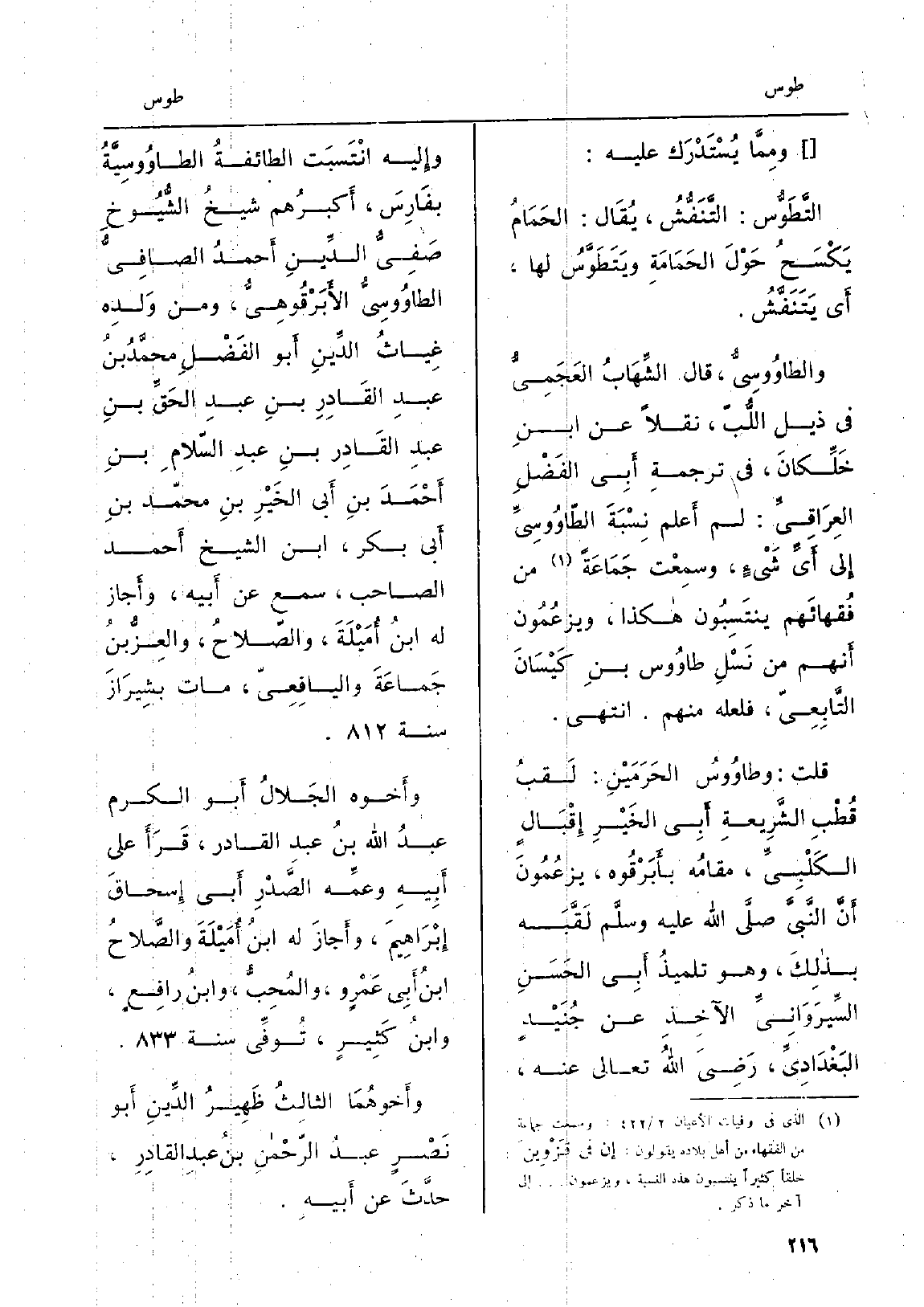 ومِمّا يُسْتَدْرَكُ عَليه: {التَّطَوُّس: التَّنَفُّشُ، يُقَال: الحَمَامُ يَكْسَحُ حَوْلَ الحَمَامَةِ} ويَتَطَوَّسُ لَهَا، أَي يَتَنَفَّشُ. {- والطاوُوسِيُّ، قَالَ الشِّهَابُ العَجَمِيُّ فِي ذيل اللُّبّ، نقلا عَن ابنِ خَلِّكانَ، فِي ترجمةِ أَبِي الفَضْلِ العِرَاقِيِّ: لم أَعْلم نِسْبَةَ} - الطّاوُوسِيِّ إِلى أَيِّ شَيْءٍ، وسمِعْت جَمَاعَةً من فُقهائَهم ينتَسِبُون هَكَذَا، ويزعُمُون أَنهم من نَسْلِ {طاوُوس بنِ كَيْسَانَ التَّابِعِيّ، فَلَعَلَّهُ مِنْهُم. انْتهى. قلت:} وطاوُوسُ الحَرَمَيْنِ: لَقبُ قُطْبِ الشَّرِيعةِ أَبِي الخَيْرِ إِقْبَالٍ الكَلْبِيِّ، مقامُه بأَبَرْقوه، يزعُمُونَ أَنَّ النَّبِيَّ صلَّى الله عَلَيْهِ وسلَّم لَقَّبَه بذلِكَ، وَهُوَ تلميذُ أَبِي الحَسَنِ السِّيرَوَانِيِّ الآخِذِ عَن جُنَيْدٍ البَغْدَادِيِّ، رَضِيَ الله تَعَالَى عَنهُ، وإِليه انْتَسَبَت الطائفةُ! الطاوُوسِيَّةُ بفَارِسَ، أَكْبرُهم شيخُ الشُّيُوخِ صَفيُّ الدّينِ أَحْمدُ الصافِيُّ الطاوُوسِيُّ الأَبَرْقُوهِيُّ، وَمن وَلدِه غِياثُ الدِّينِ أَبو الفَضْلِ محمَّد بنُ عبدِ القَادِرِ بنِ عبدِ الحَقِّ بنِ عبدِ القَادِر بن عبدِ السّلامِ بنِ أَحْمَدَ بنِ أَبي الخَيْرِ بنِ محمّد بنِ أَبي بكر، ابْن الشَّيْخ أَحمد الصاحب، سمع عَن أَبيه، وأَجاز لَهُ ابنُ أُمَيْلَةَ، والصّلاحُ، والعِزُّبنُ جَماعَةَ والنافِعِيّ، مَاتَ بشِيرَازَ سنة.