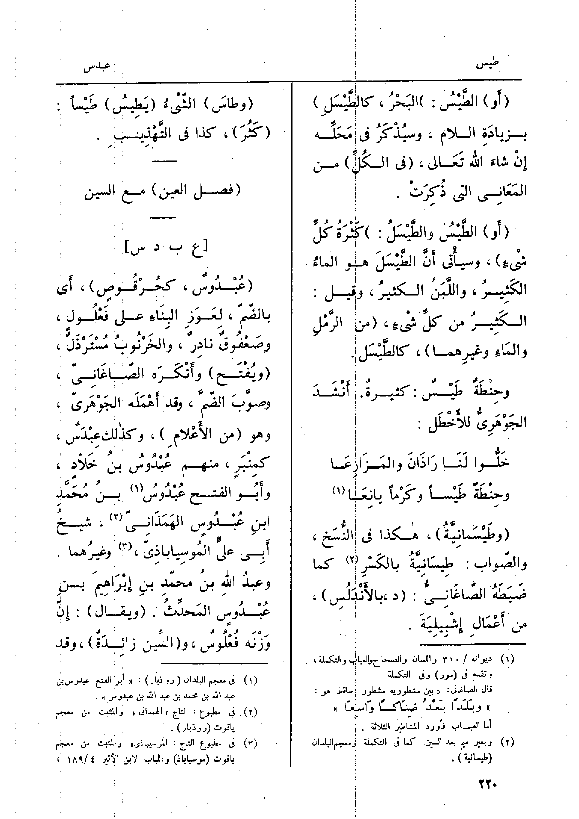 } وطَيْسَمانِيَّةُ، هَكَذَا فِي النُّسَخ، والصّواب: طِيسَانِيَّةُ بالكَسْرِ كَمَا ضَبَطَه الصّاغَانِيُّ: د، بالأَنْدَلُسِ، من أَعْمَالِ إِشْبِيلِيَةَ.! وطاسَ الشّيْءُ يَطِيسُ طَيْساً: كَثُرَ، كَذَا فِي التَّهْذِيبِ.