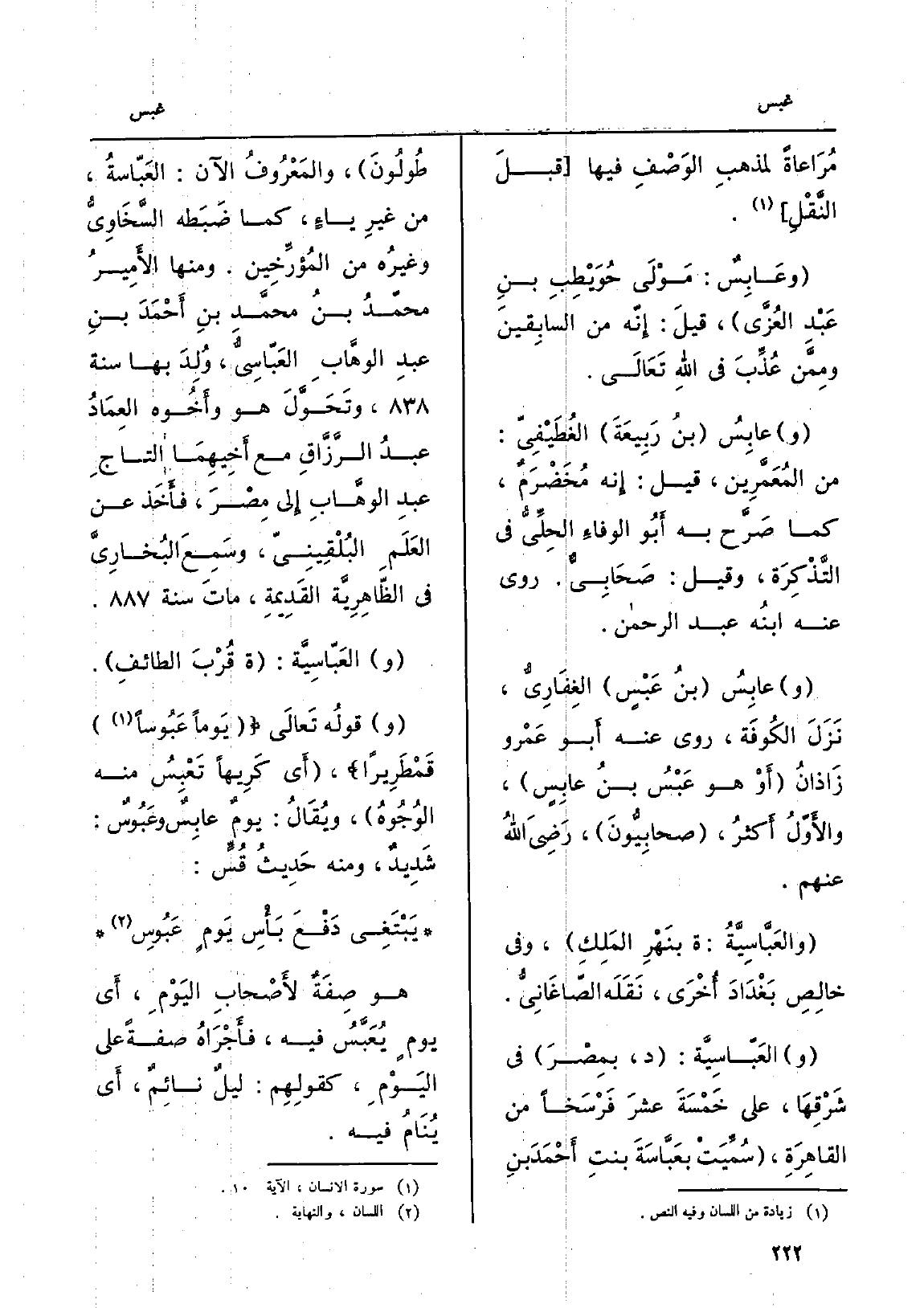 ً مُرَاعاةً لمذهبِ الوَصْفِ فِيهَا قبلَ النَّقْلِ. وعَابِسٌ: مَوْلَى حُوضيْطِبِ بنِ عَبْدِ العُزَّى، قيلَ: إِنّه من السابِقين ومِمَّن عُذِبَ فِي اللهِ تَعَالَى. وعابِسُ بنُ رَبِيعَةَ الغُطَيْفِيّ: من المُعَمَّرَيين، قيل: إِنه مُخَضْرَمٌ، كَمَا صَرَّح بِهِ أَبُو الوفاءِ الحِلِّيُّ فِي التَّذْكِرَة، وَقيل:) صَحَابِيٌّ. روى عَنهُ ابنُه عبد الرَّحْمَن. وعابِسُ بنُ عَبْسٍ الغِفَارِيُّ، نَزَلَ الكُوفَة، روى عَنهُ أَبو عَمْرو زَاذانُ أَوْ هُوَ عَبْسُ بنُ عابِسٍ، والأَوّلُ أَكثرُ، صحابِيُّونَ، رَضِيَ اللهُ عَنْهُم. والعَبَّاسِيَّةُ: ة بنَهْرِ المَلِكِ، وَفِي خالِصِ بَغْدَادَ اُخْرَى، نَقَلَه الصّاغَانِيُّ. والعَبّاسِيَّة: ج، بمِصْرَ فِي شَرْقِهَا، على خَمْسَةَ عشرَ فَرْسَخاً من القاهِرَةِ، سُمِّيَةْ بعَبَّاسَةَ بنتِ أَحْمَدَ بنِ طُولُون، والمَعْرُوفُ الْآن: العَبّاسةُ، من غيرِ ياءٍ كَمَا ضَبَطه السّخَاوِيُّ وغيرُه من المُؤرِّخِين. وَمِنْهَا الأَمِيرُ محمّدُ بنُ محمَّدِ بنِ أَحْمَدَ بنِ عبدِ الوهَّابِ العَبّاسِيُّ، وُلِدَ بهَا سنة، وتَحَوَّلَ هُوَ وأَخُوه العِمَادُ عبدُ الرَّزَّاقِ مَعَ أَخِيهِمَا التاجِ عبدِ الوهَّابِ إِلى مِصْرَ، فأَخَذَ عَن العَلَمِ البُلْقِينِيّ، وسَمِعَ البُخارِيَّ فِي الظّاهِرِيَّة القَدِيمةِ، مَاتَ سنة. والعَبّاسِيَّة: ة قُرْبَ الطائفِ. وقولُه تَعالَى: يَوماً عَبُوساً قَمْطَرِيراً، أَي كَرِيهاً تَعْبِسُ مِنْهُ الوُجُوهُ، ويُقَالُ: يومٌ عابِسٌ وعَبُوسٌ: شَدِيدٌ، وَمِنْه حَدِيُثُ قُيسٍ: يَبْتَغِي دَفْعَ بَأْسِ يَومٍ عَبُوِس هُوَ صِفَةٌ لأصٍ حابِ اليَومِ، أَي يومٍ يُعَبّسُ فِيهِ، فأَجْرَاهُ صفة على اليَوْمِ، كقولِهِم: ليلٌ نائِمٌ، أَي يُنَامُ فِيهِ.