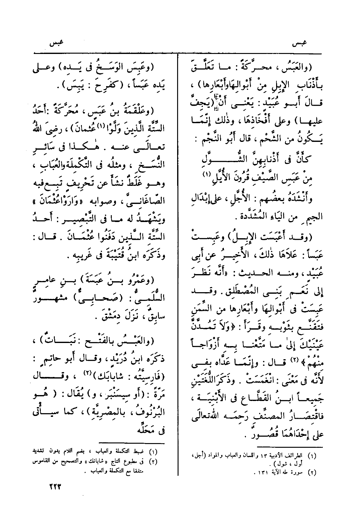 وأَنْشَدَهُ بعضُهم: الأُجَلِ، على إِبْدَالِ الجيمِ من اليَاءِ المُشَدَّدة. وَقد أَعْبَسَت الإِبِلُ وعَبِستْ عَبَساً: عَلاَهَا ذلكَ، الأَخِيرُ عَن أَبِي عُبَيْدٍ وَمِنْه الحَدِيث: أَنَّه نَظرَ إِلى نَعَمِِ بَنِي المُصْطَلِق. وَقد عَبِسَتْ فِي أَبْوالِهَا وأَبْعَارِها من السِّمَنِ فتَقَنَّع بثَوْبهِ وقَرَأَ: وَلَا تَمُدَّنَّ عَيْنَيْكَ إِلى مَا مَتَّعْنا بِهِ أَزْواجاً مِنْهُمْ قَالَ: وإِنَّمَا عَدَّاه بفِي لأَنَّه فِي مَعْنَى: انْغَمَسَتْ. وذَكَرَ اللُّغَتَيْنِ جَمِيعاً ابنُ القَطَّع فِي الأَبْنِيَة، فاقْتِصَارُ المصنِّفِ رَحِمَه الله تعالَى على إِحْدَاهُمَا قُصُورٌ. وعَبِسَ الوَسَخُ فِي يَدِه وعَلى يَدِهِ عَبَساً، كفَرِحَ: يَبِسَ. وعَلْقَمَةُ بنُ عَبَسٍ، مُحَرَّكَةً: أَحَدُ السِّتَّةِ الَّذِينَ وَلَّوْا عُثْمانَ، رضِيَ اللهُ تعالَى عَنهُ. هَكَذَا فِي سَائِرِ النُّسَخِ، ومثلُه فِي التّكْمِلَة والعُبَابِ، وَهُوَ غَلَطٌ نشَأَ عَن تَحْرِيفٍ تَبِع فِيهِ الصّاغَانِيُّ، وَصَوَابه وَرَوْا عُثْمَانَ، ويَشْهَدُ لَهُ مَا فِي التَّبْصِير: أَحدُ السِّتَّةِ الَّذِين دَفَنُوا عُثْمَانَ.