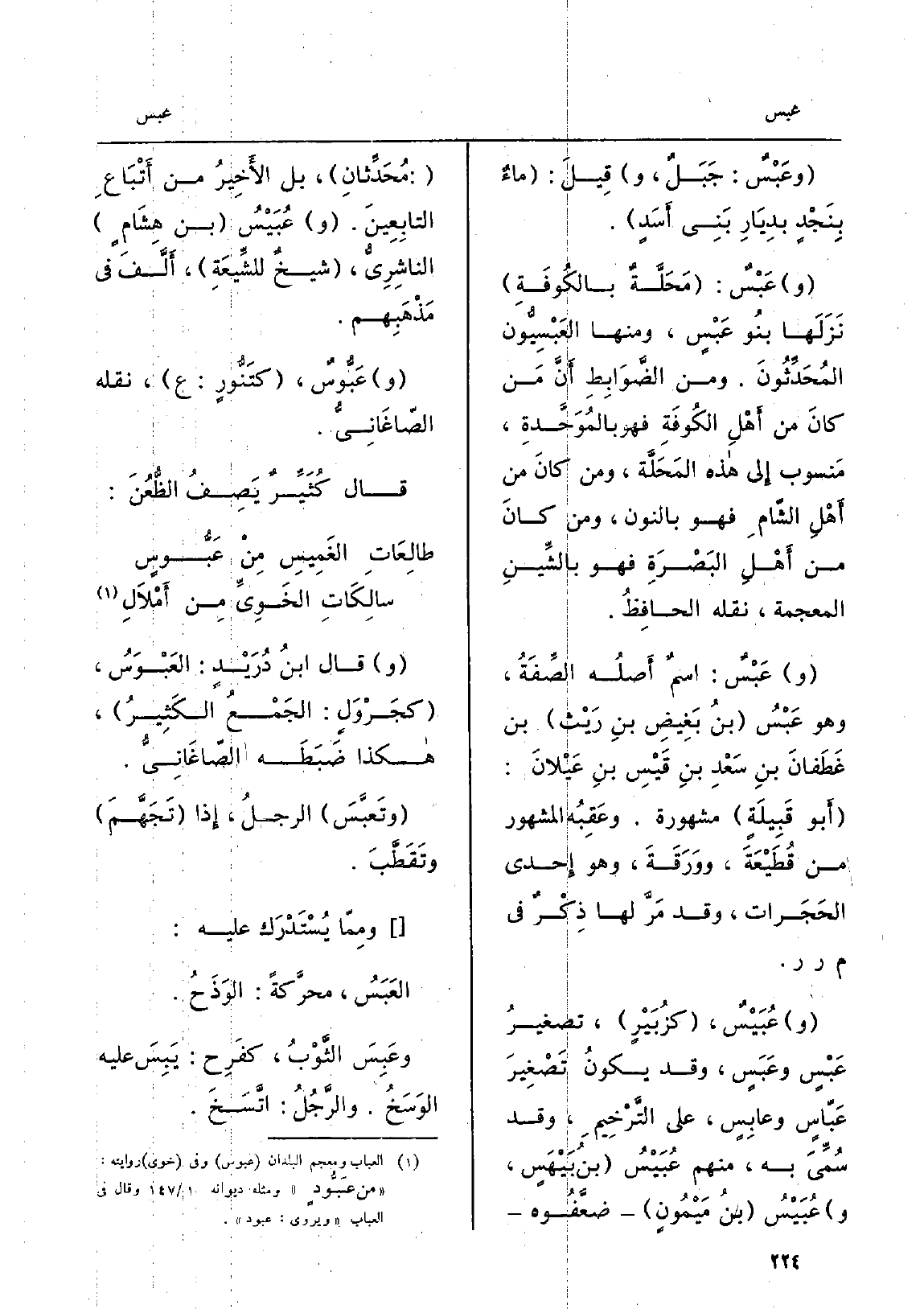 وعَبْسٌ: اسمٌ أَصْلُه الصَّفَةُ، وَهُوَ عَبْسُ بنُ بَغِيضٍ بنِ رَيْث بن غَطَفَانَ بنِ سَعْدِ بنِ قَيٍ سِ بنِ عَيْلانَ: أَبو قَبِيلَة مَشْهُورَة. وعَقِبُه الْمَشْهُور من قُطَيْعَةَ، ووَرَقَةَ، وَهُوَ إِحدى الحَجَرات، وَقد مَرَّ لَهَا ذِكْرٌ فِي م ر ر. وعُبَيْسٌ، كزُبَيْرٍ، تصغيرُ عَبْسٍ وعَبَسٍ، وَقد يكونُ تَصْغِيرَ عَبّاسٍ وعابسٍ، على التَّرْخِيمِ، وقدت سُمِّيَ بِهِ، مِنْهُم عُبَيْسُ بنُ بَيْهَسٍ، وعُبَيْسُ بنُ مَيْمُونٍ ضعَّفُوه: مُحَدِّثَانِ، بل الأَخِيرُ من أَتْبَاعِ التابِعِينَ. وعُبَيْسُ بن هِشَامٍ الناشِرِيُّ، شيخٌ للشِّيعَةِ، أَلَّفَ فِي مَذْهَبِهم. وعَبُّوسٌ، كتَنُّورٍ: ع، نَقله الصّاغَانِيُّ. قَالَ كُثَيِّرٌ يَصِفُ الظَّعُنَ: