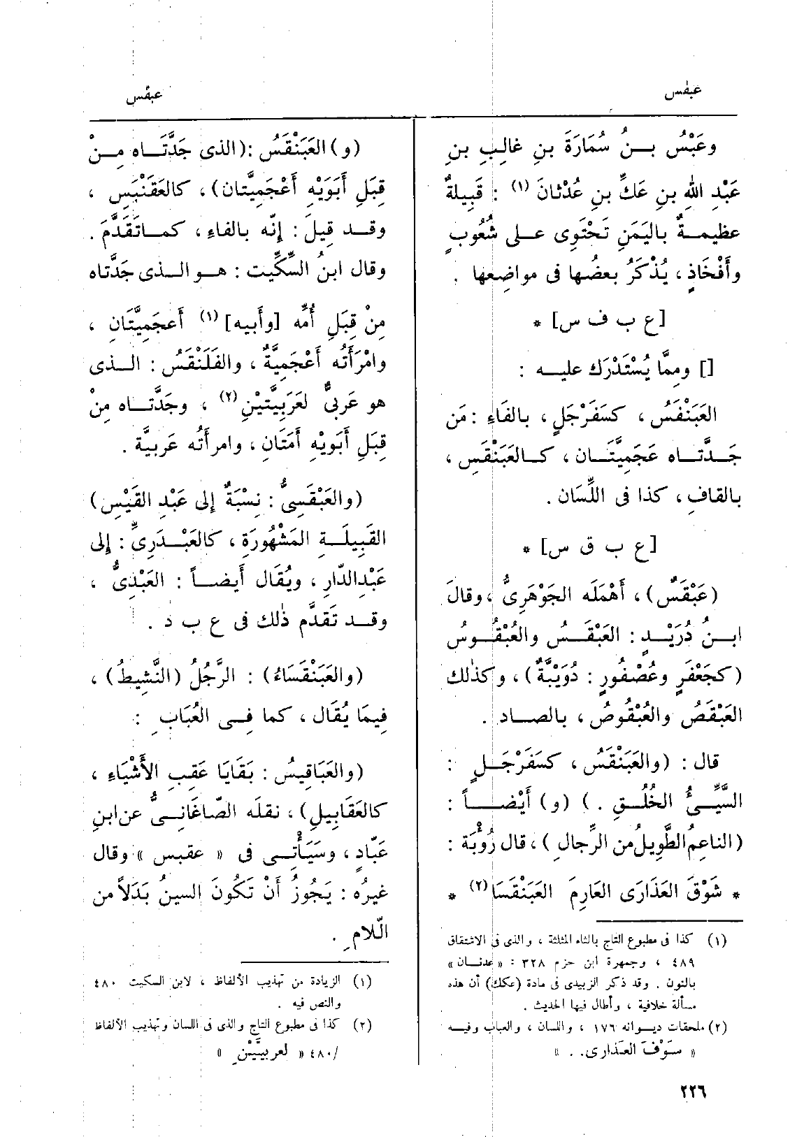 عَبْقَسٌ، أَهْمَلَه الجَوْهَرِيُّ، وقالَ ابنُ دُرَيْدٍ: العَبْقَسُ والعُبْقُوسُ كجَعْفَرٍ وعُصْفُورٍ: دُوَيْبَّةٌ، وَكَذَلِكَ العَبْقَصُ والعُبْقُوصُ، بالصَّاد. قَالَ: والعَبَنْقَسُ، كسَفَرْجَلٍ: السَّيئُ الخُلُقِ. وأَيْضاً: الناعِمُ الطَّوِيلُ من الرِّجالِ، قَالَ رُؤْبَة: شَوْقَ العَذَارى العارِمَ العَبَنْقَسَا. والعَبَنْقَسُ: الَّذِي جَدَّتَاه مِنْ قِبَلِ أَبَوَيْهِ أَعْجَمِيَّتان، كالعَقَنْبَسِ، وَقد قِيلَ: إِنّه بالفاءِ، كَمَا تَقَدَّمَ. وَقَالَ ابنُ السِّكِّيت: هوا لذِي جَدَّتاه مِنْ قِبَلِ أُمِّه وأَبِيه أَعْجَمِيَّتَانِ، وامْرَأَتُه أَعْجَمِيَّةٌ، والفَلَنْقَسُ: الَّذِي هُوَ عَرَبيٌّ لعَرَبِيَّتيْنِ، وجَدًَّتاه مِنْ قِبَلِ أَبَويْهِ أَمَتَانِ، وامرأَتُه عَربيَّة. والعَبْقَسِيُّ: نِسْبَةٌ إِلى عَبْدِ القَيْسِ القَبِيلَةِ المَشْهُورَةِ، كالعَبْدَرِيِّ: إِلى عَبْدِ الدّارِ، ويُقال أَيَاً: العَبْدِيُّ، وَقد تَقَدَّم فِي ع ب د. والعَبَنْقَسَاءُ: الرَّجُلُ النَّشِيطُ، فِيمَا يُقَال، كَمَا فِي العُبَابِ: والعَبَقِيسُ: بَقَايَا عَقِبِ الأَشْيَاءِ، كالعَقَابِيلِ، نقلَه الصّاغَانِيُّ عَن ابنِ عَبّادٍ، وسَيَأْتِي فِي عقْبس وَقَالَ غيرُه: يَجُوزُ أَنْ تَكُونَ السينُ بَدَلاً من اللاّمِ.