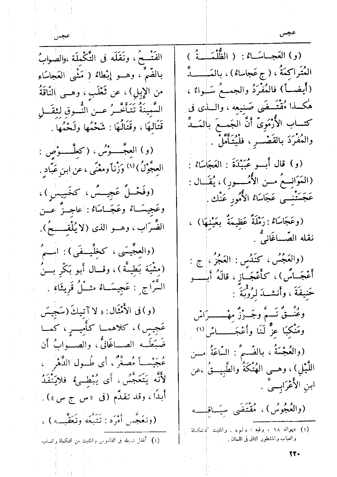 والعُجُوسُ، مُقْتَضَى سِيَاقِه الفَتْحُ، ونَقَلَه فِي التَّكْمِلَة، والصوابُ بالضَّمِّ، وَهُوَ إِبْطاءُ مَشي العَجاسَاءِ من الإِبِلِ، عَن ثَعْلَبٍ، وَهِي النّاقَةُ السَّمِينَةُ تَتَأَخَّرُ عَن النُّوقِ لِثِقَلِ قَتَالِهَا، وقَتَالُهَا: شَحْمُها ولَحْمُها. العِجَّوْسُ، كعِلَّوْصٍ: العِجَّوْلُ وَزْناً ومعْنَىً، عَن ابْن عَبّادٍ. وفَحْلٌ عَدِيسٌ، كخَسِيسٍ، وعَجِيسَاءُ وعَجَاسَاءُ: عاجِزٌ عَن الضِّراب، وَهُوَ الَّذِي لَا يُلْقِحُ. والعِجِّسَي، كخِلِّيفَى: اسمُ مِشْيَة بَطِيئَة، وَقَالَ أَبو بَكرِ بنُ السَّرّاجِ: عَجِيسَاءُ مثلُ قَريثَاءَ. وَفِي الأَمْثَال: لَا آتِيكَ سَجِيسَ عَجِيسٍ، كِلَاهُمَا كأَمِيرٍ، كَمَا ضَبَطَه الصاغَانيُّ، والصَّوابُ أَن عُجَيْساً مُصغَّرٌ، أَي طُول الدَّهْرِ، لأنَّه يَتَعَجَّسُ، أَي يُبْطِيءُ فَلَا يَنْفَدُ أَبداً، وَقد تقدّم فِي س ج س. وتَعَجَّس أَمْرَه: تَتَبَّعَه وتَعَقَّبه،