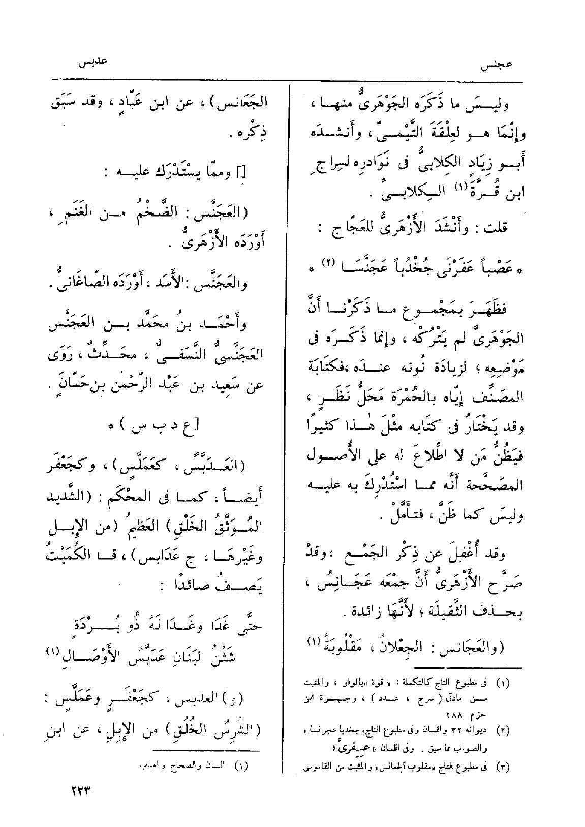 وليسَ مَا ذَكَرَه الجَوْهَرِيُّ مِنْهَا، وإِنّمَا هُوَ لعِلْقَةَ التَّيْميّ، وأَنشدَه أَبو زِيَادٍ الكِلابيُّ فِي نَوَادِرِه لسِراجِ ابْن قُرَّةَ الكِلابيِّ. قلت: وأَنْشَدَ الأَزْهَرِيُّ للعَجّاج: عَصْباً عَفَرْنَي جُحْدُباً عَجَنَّسَا، فظَهَرَ بمَجْمُوع مَا ذَكَرْنا أَنَّ الجَوْهَريَّ لم يَتْرُكْه، وإِنما ذَكَره فِي مَوْضِعِه، لزيادَة نُونه عندَه، فكتَابَة المصَنِّف إِيّاه بالحُمْرَة مَحَلُّ نَظَرٍ، وَقد يَخْتَارُ فِي كتَابه مثْلَ هَذَا كثيرا فيَظُنُّ مَن لَا اطِّلاعَ لَهُ على الأُصول المصَحَّحة أَنَّه مِمَّا اسْتُدْرِكَ بِهِ عَلَيْهِ وليسَ كَمَا ظَنَّ، فتأَمَّلْ. وَقد أُغْفِلَ عَن ذِكْر الجَمْع، وقدْ صَرَّح الأَزْهَرِيُّ أَنَّ جمْعَه عَجَانِسُ، بِحَذْف الثَّقِيلَة، لأَنَّها زائِدة.