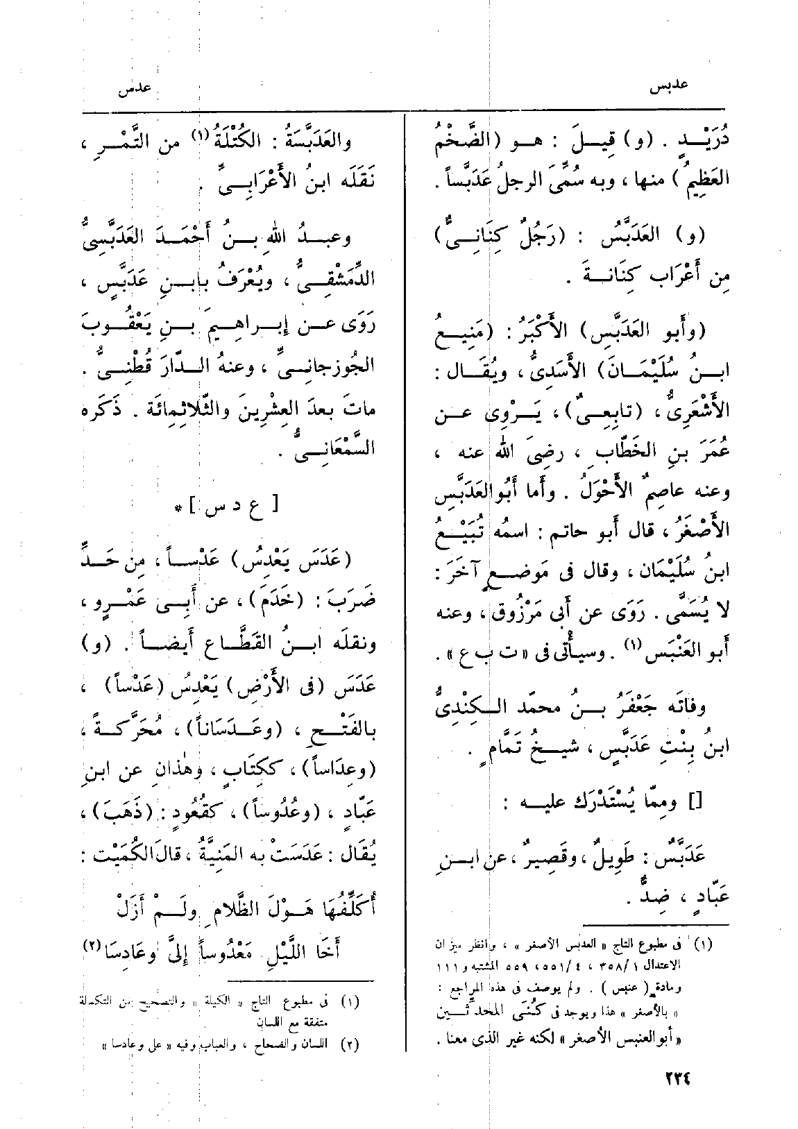 دُرَيْدٍ. وقِيلَ: هُوَ الضَّخْمُ العَظِيمُ، وَبِه سُمِّيَ الرجُلُ عَدَبَّساً. العَدَبَّسُ: رَجُلٌ كِنَانِيٌّ مِن أَعْرَاب كِنَانةَ. وَأَبُو العَدَبَّسِ الأَكْبَرُ: مَنِيعُ ابنُ سُلَيْمَانَ الأَسَدِيُّ، ويُقَال: الأَشْعَرِيُّ، تابِعِيٌ، يَرْوِي عَن عُمَرَ بنِ الخَطّابِ، رضِيَ الله عَنهُ، وَعنهُ عاصِمٌ الأَحْوَلُ. وأَما أَبُو العَدَبَّسِ الأَصْغَرُ، قَالَ أَبو حَاتِم: اسمُهُ تُبَيْعُ ابنُ سُلَيْمان، وَقَالَ فِي مَوضِعٍ آخَرَ: لَا يُسَمَّى. رَوَى عَن أَبِي مَرْزُوق، وَعنهُ أَبو العَنْبَس. وسيأْتِي فِي ت ب ع.