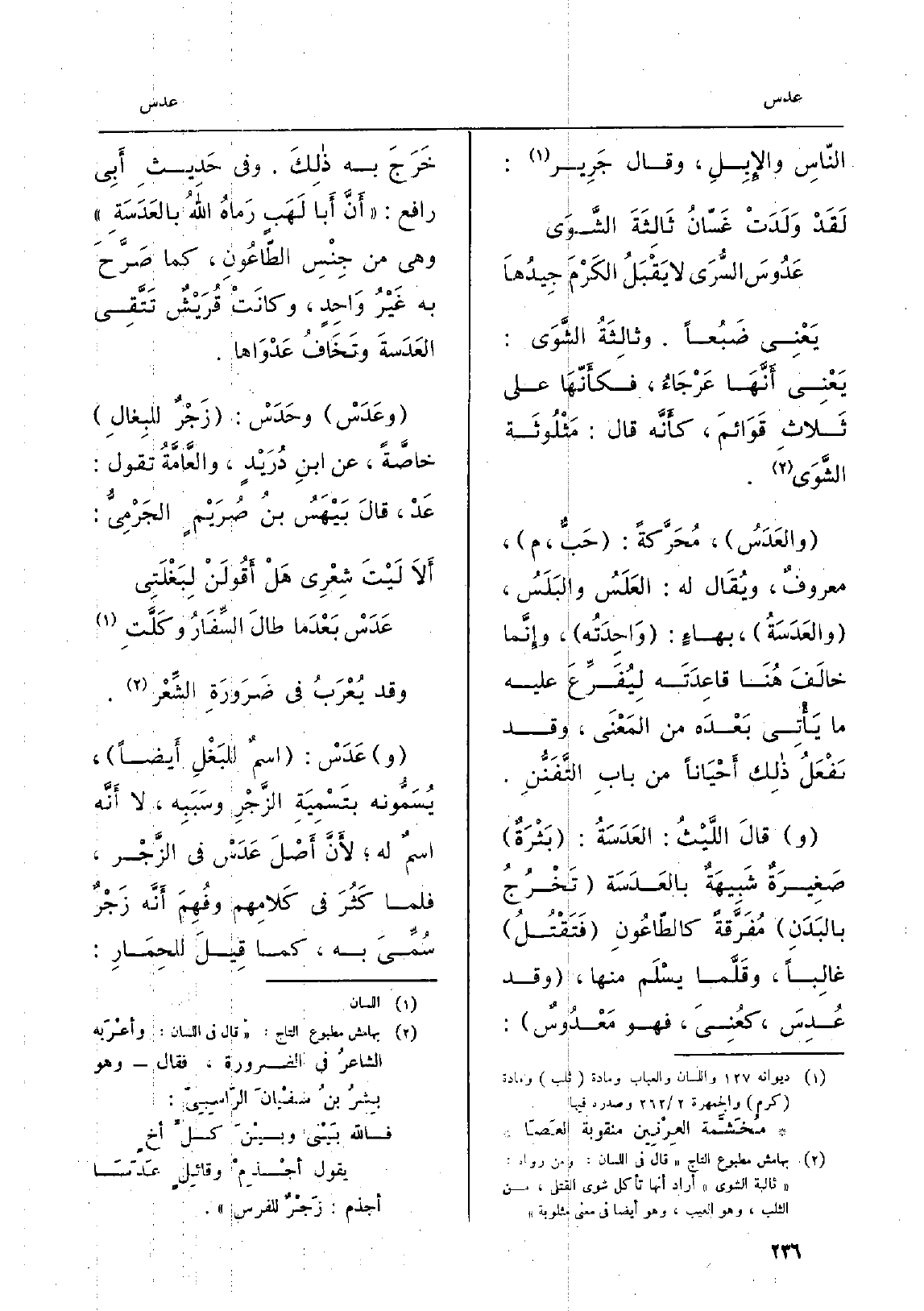 يَعْنِي ضَبُعاً. وثالِثَةُ الشَّوَى: يَعْنِي أَنَّها عَرجاءُ، فكأَنّهَا على ثَلاثِ قَوائمَ، كأَنَّهُ قَالَ: مَثْلُوثَة الشَّوَى. والعَدَسُ، مُحَرَّكةً: حَبٌّ، م، معروفٌ، ويُقَال لَهُ: العَلَسُ والبَلَسُ، والعَدَسَةُ، بهاءٍ: وَاحِدَتُه، وإِنَّما خالَفَ هُنَا قاعِدَتَه لِيُفَرِّعَ عَلَيْهِ مَا يَأْتِي بَعْدَه من المَعْنَى، وَقد تَفْعَلُ ذلِكَ أَحْيَاناً من بابِ التَّفَنُّنِ. قالَ اللَّيْثُ: العَدَسَةُ: بَثْرَةٌ صَغِيرَةٌ شَبِيهَةٌ بالعَدَسَة تَخْرُجُ بالبَدَنِ مُفَرَّقَةً كالطّاعُونِ فَتَقْتُلُ غالِباً، وقَلَّما يسْلَم مِنْهَا، وَقد عُدِسَ، كعُنِيَ، فَهُوَ مَعْدُوسٌ: خَرَجَ بِهِ ذلكَ. وَفِي حَدِيثِ أَبِي)