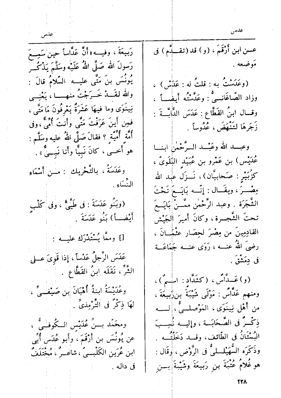 ُ عَن ابْن أَرْقَمَ، وَقد تقدَّم فِي مَوضعه. وعَدَسْتُ بِهِ: قلتُ لَهُ: عَدَسَ الدَّابَّةَ: زَجَرَهَا لتَنْهَضَ، عُدُوساً. وَعبد الله وعَبْد الرَّحْمن ابْنا عُدَيْس بن عَمْرو بن عُبَيْدٍ البَلَويّ، كزُبَيْرٍ: صَحابيَّان، نَزَل عبد الله مِصْرَ، ويقَال: إِنّه بَايَعَ تَحْتَ الشَّجَرة، وكانَ أَمِيَر الجَيْش القادِمِينَ من مِصْرَ لحِصَار عُثْمانَ، رَضيَ اللهُ عَنهُ، رَوَى عَنهُ جَمَاعَة فِي دِمَشْقَ. عَدَّاسٌ، كشَدَّادٍ: اسمٌ، وَمِنْهُم عَدَّاسٌ: مَوْلَى شَيْبَةَ بن رَبِيعَةَ، من أَهْل نِينَوَى، المَوْصلِيُّ، لَهُ ذِكْرٌ فِي الصَّحَابَة، وإِليه نُسِبَ البُسْتَانُ فِي الطّائف، وَقد دَخَلْتُه. وذَكَرَه السُّهَيْلليُّ فِي الرَّوْض، وقَال: هُوَ غُلامُ عُتْبَةَ بنِ رَبِيعَةَ وشَيْبَةَ بنِ رَبِيعَةَ، وَفِيه أَنَّ عَدَّاساً حِين سَمِعَ رَسُولَ الله صَلَّى اللهُ عَلَيْه وسَلَّمَ يَذْكُر يُونُسَ بنَ مَتَّى عَلَيْهِ السّلامُ قالَ: وَالله لقَدْ خَرَجْتُ مِنْهَا، يَعْنِي نِينَوَى وَمَا فيهَا عَشَرَةٌ يَعْرِفُونَ مَا مَتَّى، فمِن أَيْنَ عَرَفْتَ مَتّى وأَنْتَ أُمِّيٌّ، وَفِي أُمَّةٍ أُمِّيّةٍ فَقَالَ صَلَّى اللهُ عَلَيْهِ وسَلَّم: هُوَ أَخِي، كانَ نَبِيّاً وَأَنا نَبِيٌّ. وعَدَسَةُ، بالتَّحْريك: من أَسْمَاءِ النِّسَاءِ. وبَنُو عَدَسَةَ: فِي طَيِّءٍ، وَفِي كَلْبٍ أَيْضاً بَنُو عَدَسَةَ. وممَّا يُسْتَدْرَكُ عَلَيْهِ: عَدَسَ الرَّجُلُ عَدْساً، إِذا قَوِيَ على الشَّرِّ، نَقَلَه ابنُ القَطَّاع. وعُدَيْسَةُ)