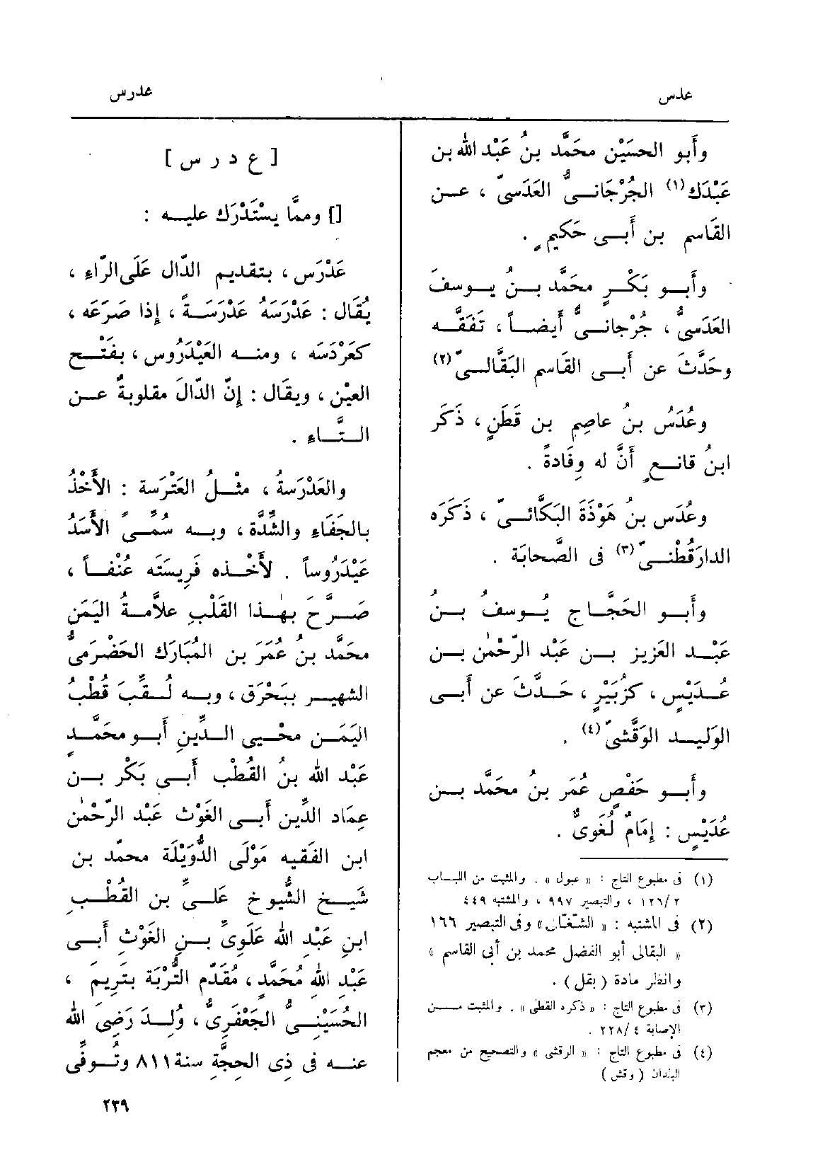 وأَبو الحسَيْن محَمَّد بنُ عَبْد الله بن عَبْدَك الجُرْجَانيُّ العَدَسيّ، عَن القَاسم بن أَبي حَكيمٍ. وأَبو بَكْرٍ محَمَّد بنُ يوسفَ العَدَسيُّ، جُرْجانِيٌّ أَيْضاً، تَفَقَّه وحَدَّثَ عَن أَبي القَاسم البَقَّالِيّ. وعُدَسُ بنُ عاصِم بن قَطَنٍ، ذَكَر ابنُ قانِعٍ أَنَّ لَهُ وِفَادةً. وعُدَس بنُ هَوْذَةَ البَكَّائِيّ، ذَكَرَه الدارَقُطْنيّ فِي الصَّحابَة. وأَبو الحَجَّاج يُسفُ بنُ عَبْد العَزِيز بن عَبْد الرّحْمن بن عُدَيْسٍ، كزُبَيْرٍ، حَدَّثَ عَن أَبي الوَليد الوَقَّشيّ. وأَبو حَفْصٍ عُمَر بنُ محَمَّد بن عُدَيْسٍ: إِمَامٌ لُغَوِيٌّ.