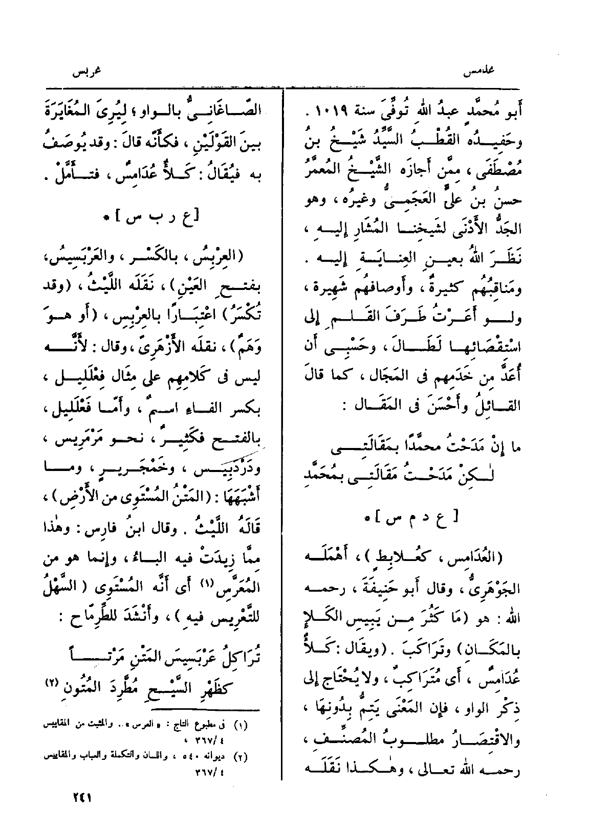 العُدامِس، كعُلابِطٍ، أَهْمَلَه الجَوْهَرِيُّ، وَقَالَ أَبو حَنِيفَةَ، رَحمَه الله: هُوَ مَا كَثُرَ مِن يَبِيسِ الكَلإِ بالمَكَانِ وتَرَاكَبَ. ويقَال: كَلأٌ عُدَامِسٌ، أَي مُتَرَاكِبٌ، وَلَا يُحْتَاج إِلى ذِكْرِ الْوَاو، فإِن المَعْنَى يَتِمُّ بِدُونِهَا، والاقْتِصَارُ مطلوبُ المُصنِّفِ، رَحمَه الله تَعَالَى، وَهَكَذَا نَقَلَه الصّاغَانِيُّ بِالْوَاو، لِيُرِيَ المُغَايَرَةَ بينَ القَوْلَيْنِ، فكأَنّه قالَ: وَقد يُوصَفُ بِهِ فيُقَالُ: كَلأٌ عُدَامِسٌ، فتأَمَّلْ.