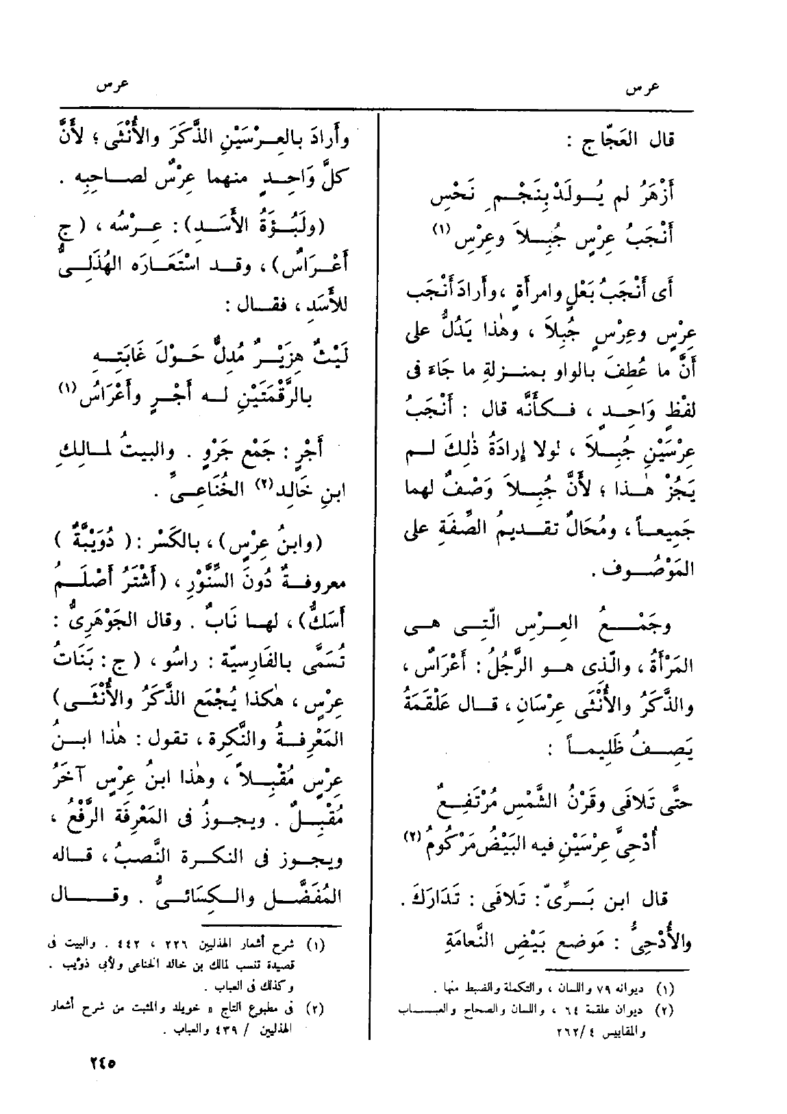 أَي أَنْجَبُ بَعْلٍ وامرأَةٍ، وأَرادَ أَنْجَب عِرسٍ وعِرْسٍ جُبِلاَ، وَهَذَا يَدُلُّ على أَنَّ مَا عُطِفَ بِالْوَاو بمنزلةِ مَا جاءَ فِي لفْظٍ وَاحِدٍ، فكأَنَّه قَالَ: أَنْجَبُ عِرْسَيْنِ جُبِلاَ، لَوْلَا إِرادَةُ ذلِكَ لم يَجُزْ هَذَا، لأَنَّ جُبِلاَ وَصْفٌ لَهما جَمِيعاً، ومُحَالٌ تقديمُ الصِّفَةِ على المَوْصُوف. وجَمْعُ العِرْسِ الّتِي هِيَ المَرْأَةُ، والّذِي هُوَ الرَّجُلُ: أَعْرَاسٌ، والذَكَرُ والأُنْثَى عِرْسَانِ، قَالَ عَلْقَمَةُ يَصِفُ ظَلِيماً: