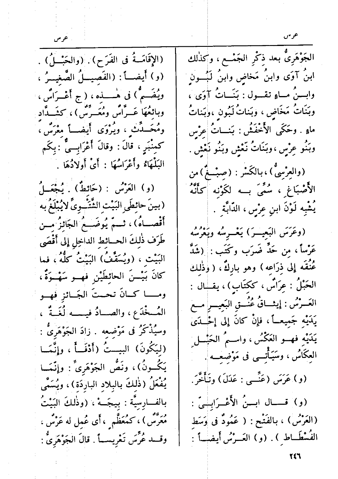 الجَوْهَرِيُّ بعد ذِكْرِ الجَمْع، وَكَذَلِكَ ابنُ آوَى وابنُ مَخاضٍ وابنُ لَبُونٍ وابنُ ماءٍ تَقول: بَنَاتُ آوَى، وبَنَاتُ مَخَاضٍ وبَناتُ لَبْونٍ، وبَناتُ ماءٍ. وحَكَى الأَخْفَشُ: بَناتُ عِرْسٍ وبَنُو عِرْسٍ، وبَناتُ نَعْشٍ وبَنُو نَعْشٍ. والعِرْسِيُّ، بالكَسْر: صِبْغٌ من الأَصْبَاغِ، سُمِّيَ بِهِ لكَوْنِه كأَنَّهُ يُشْبِه لَوْنَ ابنِ عِرْسٍ، الدّابَّةِ. وعَرَسَ البَعِيرَ يَعْرِسُهُ ويَعْرُسُه عَرْساً، مِن حَدِّ ضَرَب وكَتَب: شَدَّ عُنُقَه إِلى ذِرَاعِه وَهُوَ بارِكٌ، وَذَلِكَ الحَبْلُ: عِرَاسٌ، ككِتَابٍ، يُقَال: العَرْسُ: إِيثاقُ عُنُقِ البَعِيرِ مَعَ يَدَيْه جَمِيعاً، فإِنْ كانَ إِلى إِحْدَى يَدَيْهِ فَهُوَ العَكْسُ، واسمُ الحَبْلِ العِكَاسُ، وسَيَأْتِي فِي مَوْضِعِه.