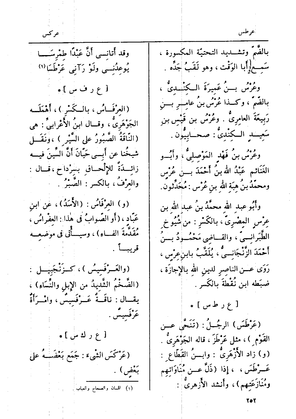 والعِرْفَاسُ: الأَسَدُ، عَن ابنِ عَبّادٍ، أَو الصّوابُ فِي هَذَا: العِفْراسُ، مُقَدَّمَة الفاءِ، وسيأْتِي فِي موضِعِه قَرِيبا. والعَرْفَسِيسُ، كزَنْجَبِيل: الضَّخْمُ الشَّدِيدُ من الإِبلِ والنِسَاءِ، يُقَال: ناقَةٌ عَرْفَسِيسٌ، وامْرَأَةٌ عَرْفَسِيسٌ