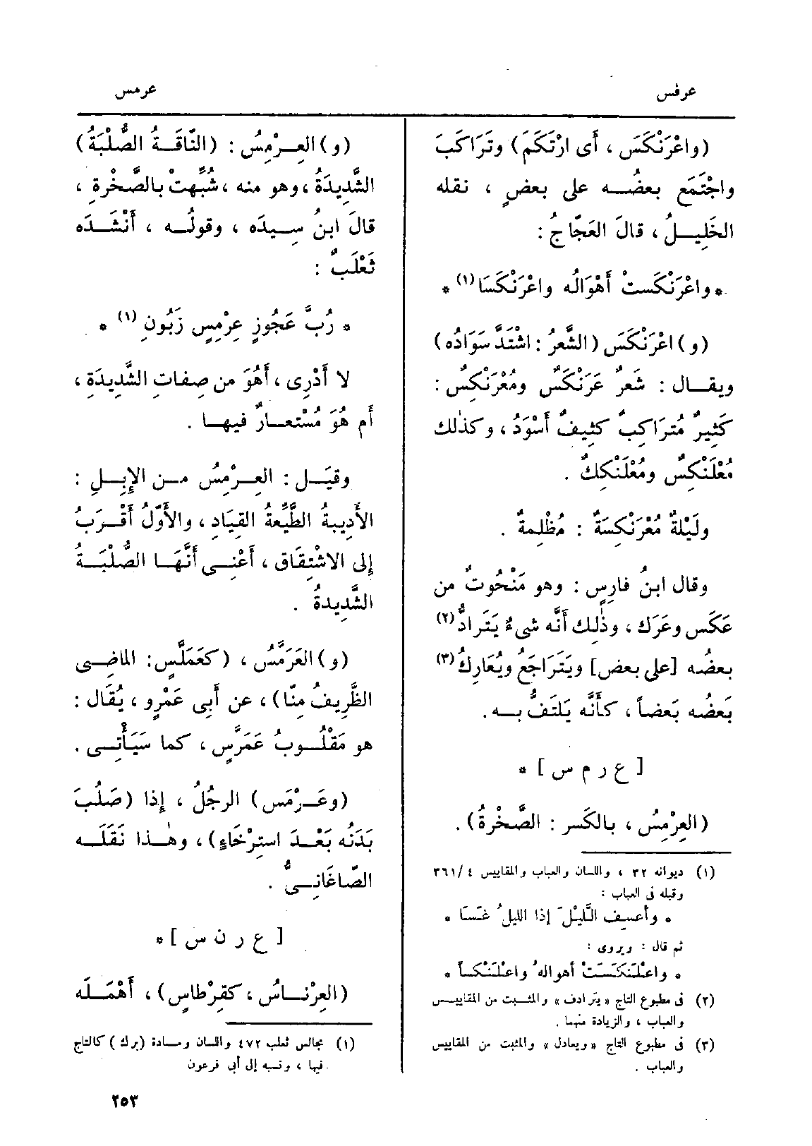 العِرْمِسُ، بالكَسر: الصَّخْرةُ. والعِرْمِسُ: النّاقَةُ الصُّلْبَةُ الشَّدِيدَةُ، وَهُوَ مِنْهُ، شُبِّهَتْ بالصّخْرَةِ، قالَ ابنُ سِيدَه، وقولُه، أَنْشَدَه ثَعلَبٌ: رُبَّ عَجُوزٍ عِرْمْسٍ زَبُونِ لَا أَدْرِي، أَهْوَ من صِفَاتِ الشِّدِيدَةِ، أَم هُوَ مُسْتعارٌ فِيهَا. وقِيلَ: العِرْمِسُ من الإِبِل: الأَدِيبةُ الطَّيِّعةُ القِيَادِ، والأَوّلُ أَقْرَبُ إِلَى الاشْتِقَاق، أَعْنِي أَنَّهَا الصُّلْبَةُ الشَّدِيدةُ. والعَرَمَّسُ، كعَمَلَّسٍ: الماضِي الظَّرِيف مِنّا، عَن أَبِي عَمْرٍ و، يُقَال: هُوَ مَقْلُِوبُ عَمَرَّسٍ، كَمَا سَيَأتِي. وعَرْمَس الرجُلُ، إِذا صَلُبَ بَدَنُه بَعْدَ اسْتِرخَاءٍ، وَهَذَا نَقَله الصّاغَانِيُّ.
