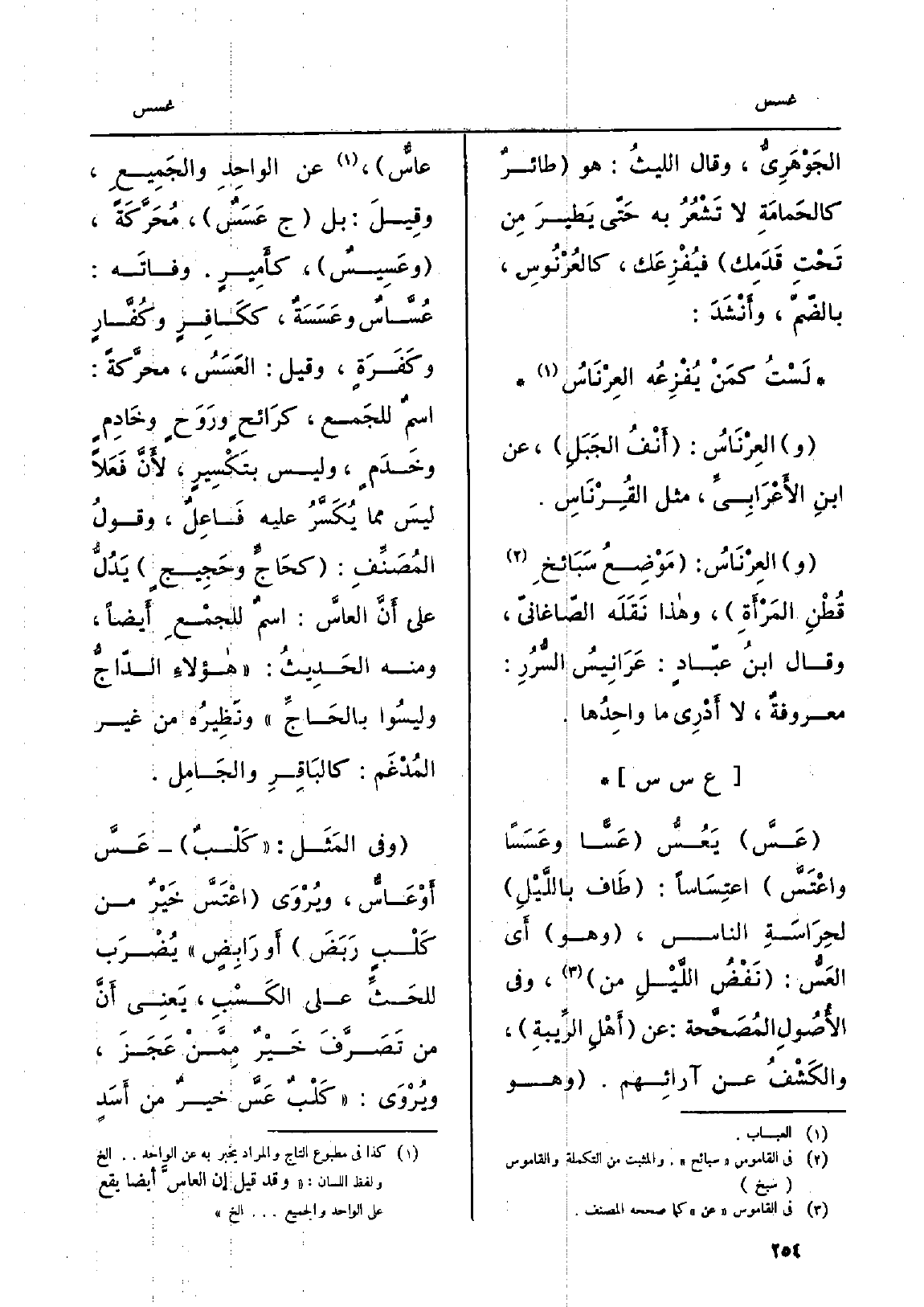 {عَسَّ} يَعُسُّ {عَسَّاً} وعَسَساً {واعْتَسَّ} اعْتِسَاساً: طَاف باللَّيْلِ لحِراسَةِ النَّاس، وَهُوَ أَي العَسُّ: نَفْضُ اللَّيْلِ من، وَفِي الأُصولِ المُصَحَّحة: عَن أَهْلِ الرِّيبةِ، والكَشْفُ عَن آرائِهم. وَهُوَ {عاسٌّ، عَن الواحِدِ والجَمِيعِ، وقِيلَ: بل (ج} عَسَسٌ) ، مُحَرِّكَةً، {عَسِيسٌ، كأَمِيرٍ. وفاتَه:} عُسّاسٌ {وعَسَسَة، ككافر وكفار وكَفَرَةٍ، وَقيل:} العَسَسُ، مُحَرَّكةً: اسمٌ للجَمع، كرَائحٍ ورَوَحٍ وخادِمٍ وخَدَمٍ، وَلَيْسَ بتكسِيرٍ، لأَنَّ فَعَلاً ليسَ مِمَّا يُكَسَّرُ عَلَيْهِ فَاعِلٌ، وقولُ المُصَنِّفِ: كحَاجٍّ وحَجِيجٍ يَدُلُّ على أَنَّ {العاسَّ: اسمٌ للجمْعِ أَيضاً، وَمِنْه الحَدِيثُ: هؤلاءِ الدّاجُّ وليسُوا بالحَاجِّ ونَظِيرُه من غير المُدْغَم: كالبَاقِرِ والجامِلِ. وَفِي المَثَل: كَلْبٌ} عَسَّ أَوْعَاسٌّ، ويُرْوَى! اعْتَسَّ خَيْرٌ من كَلْبٍ رَبَضّ أَو رَابِضٍ يُضْرَب للحَثِّ على الكَسْبِ، يَعْنِي أنَّ من تَصَرَّفَ خَيْرٌ مِمَّنْ عَجَزَ، ويُرْوَى: كَلْبٌ عَسَّ خَيْرٌ من أَسَد