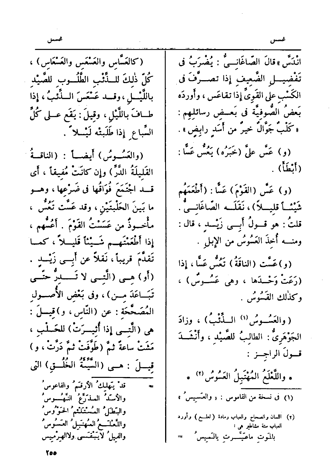 ٍ انْدَسَّ قالَ الصّاغَانِيُّ: يُضرَبُ فِي تَفْضِيلِ الضَّعِيفِ على القَوِيِّ إِذا تقاعَس، وأورَدَه بَعْضُ الصُّوفِية فِي بَعْضِ رسائِلِهم: كَلْبٌ جَوَّالٌ خيرٌ من أَسَدٍ رابِضٍ. (و) {عَسَّ عليَّ خَبَرُه} يَعُسُّ {عَسَّاً: أَبْطَأَ. وعَسَّ القَوْمَ عَسَّاً: أَطْعَمَهُمْ شَيْئاً قلِيلاً، نَقَلَه الصّاغَانِيُّ. قلتُ: هُوَ قولُ أَبِ زَيْدٍ، قَالَ: وَمِنْه أُخِذَ} العَسُوسُ من الإِبلِ. (و) {عَسَّت الناقَةُ} تَعُسُّ {عَسَّاً، إِذا رَعَتْ وَحْدَها، وَهِي} عَسُوسٌ، وَكَذَلِكَ القَسُوس. {والعَسُوسُ الذِئْبُ، وزادَ الجَوْهَرِيُّ: الطالِبُ للصَّيْدِ، وأَنْشَدَ قولَ الراجِزِ: واللَّعْلَعُ المُهْتَبِلُ} العَسُوسُ {كالعَسَّاسِ} والعَسْعَسِ {والعَسْعَاسِ، كُلّ ذلِكَ للذِئْبِ الطَّلُوبِ للصَّيْدِ باللَّيْلِ، وَقد} عَسْعَسَ الذِّئبُ، إِذا طافَ باللَّيْلِ، وقِيلَ: يَقَع على كُلِّ السِّباعِ إِذا طَلَبتْه لَيْلاً. {والعَسُوسُ أَيضاً: الناقةُ القَلِيلَةُ الدَّرِّ وَإِن كانَتْ مُفِيقاً، أَي قد اجْتَمَعَ فُوَاقُها فِي ضَرْعِها، وَهُوَ مَا بَيْنَ الحَلْبَتيْنِ، وَقد} عَسَّت {تَعُسُّ، مأْخُوذٌ من} عَسَسْتُ القَوْمَ.! أَعُسُّهم، إِذا أطْعَمْتَهم شَيْئاً قَليلاً، كَمَا تَقدَّم قَرِيباً، نَقلاً عَن أَبِي زَيْدٍ. أَو هِي)