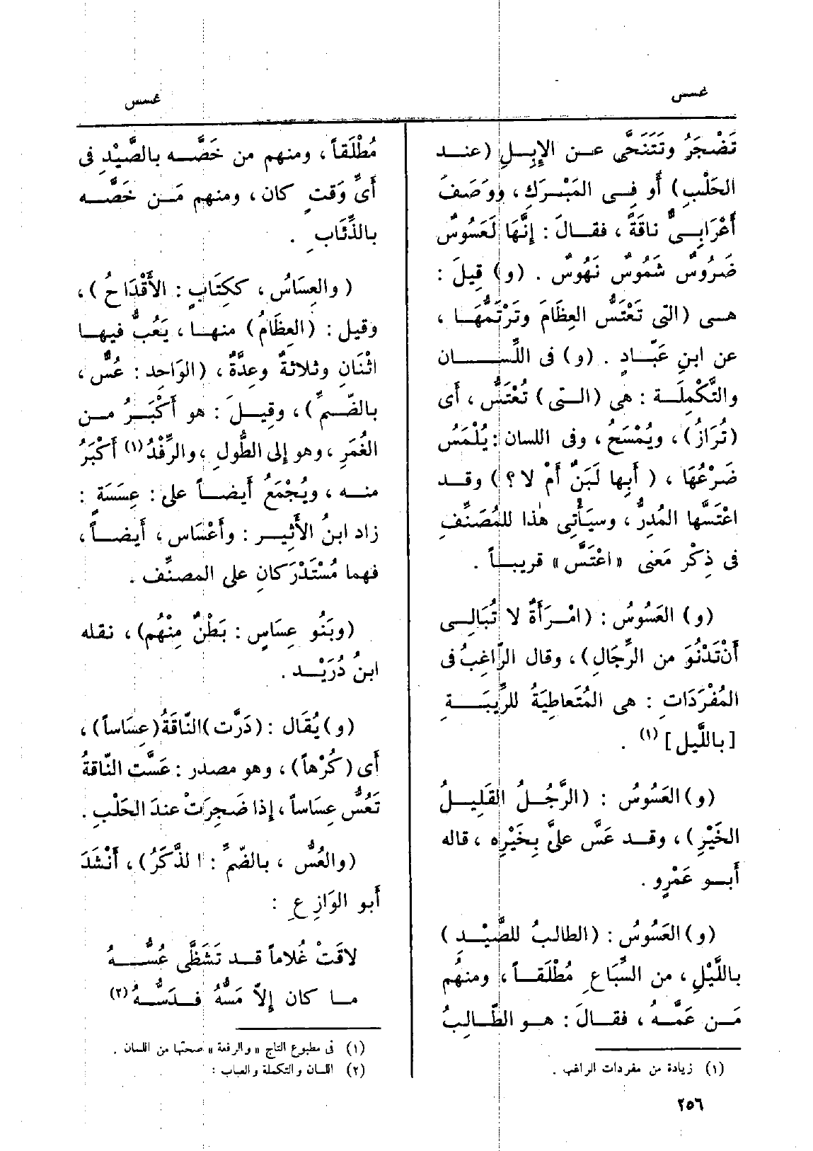 تَضْجَرُ وتَتَنَحَّى عَن الإِبِلِ عِنْد الحَلْبِ أَو فِي المَبْرَكِ، ووَصَفَ أَعْرَابيٌّ ناقَةً، فقالَ: إِنَّها {لَعَسُوسٌ ضَرُوسٌ شَمُوسٌ نَهُوسٌ. وقِيلَ: هِيَ الَّتِي} تَعْتَسُّ العِظَامَ وتَرْتَمَّهَا، عَن ابنِ عَبّادٍ. وَفِي اللِّسان والتَّكْمِلَة: هِيَ الَّتِي {تُعْتَسُّ، أَي تُرَازُ، ويُمْسَح، وَفِي اللِّسان: يُلْمَسُ ضَرْعُها، أَبِها لَبَنٌ أَمْ لَا وَقد} اعْتَسَّها المُدِرُّ، وسيأْتِي هَذَا للمُصَنِّف فِي ذِكْرِ مَعنى اعْتَسَّ قَريباً. (و) {العَسُوسُ: امرَأَةُ لَا تُبَالِي أَن تَدْنُوَ من الرِّجَالِ، وَقَالَ الراغِبُ فِي المُفْرَدَاتِ: هِيَ المُتَعاطِيَةُ للرِّيبَةِ باللَّيْلِ. (و) } العَسُوسُ: الرَّجُلُ القَلِيلُ الخَيْرِ، وَقد {عَسَّ عليَّ بِخَيْرِه، قَالَه أَبو عَمْرٍ و. (و) } العَسُوسُ: الطالِبُ للصَّيْدِ باللَّيْلِ، من السِّبَاع مُطْلَقاً، ومنهُم مَنْ عَمَّهُ، فقالَ: هُوَ الطَّالِبُ مُطْلَقَاً، وَمِنْهُم من خَصَّه بالصَّيْدِ فِي أيِّ وقْتٍ: كَانَ، وَمِنْهُم مَنْ خَصَّه بالذِئاب. {والعِسَاسُ، ككِبَابٍ: الأَقْدَاحُ، وَقيل: العِظَامُ مِنْهَا، يَعُبُّ فِيهَا اثْنَانِ وثَلاثةٌ وعِدّةٌ، الواحِد:} عُسٌّ، بالضّمِّ، وقِيلَ: هُوَ أَكْبَرُ من الغُمَرِ، وَهُوَ إِلى الطُّولِ، والرِّفْدُ أَكْبَرُ مِنْهُ، ويُجْمَعُ أَيْضَاً على {عِسَسَةٍ: زَاد ابنُ الأَثِيرِ:} وأَعْسَاس، أَيَاً، فهما مُسْتَدْرَكانِ على المُصنِّف.
