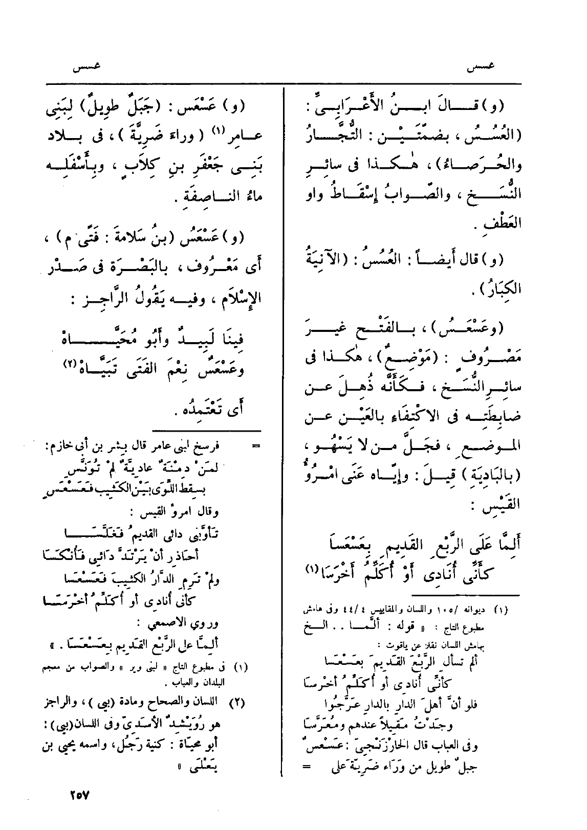 (أَلِمَّا عَلَى الرَّبْعِ القَدِيمِ} بعَسْعَساً ... كأَنِّي أُنَادِي أَوْ أُكَلِّمُ أَخْرَسا)
