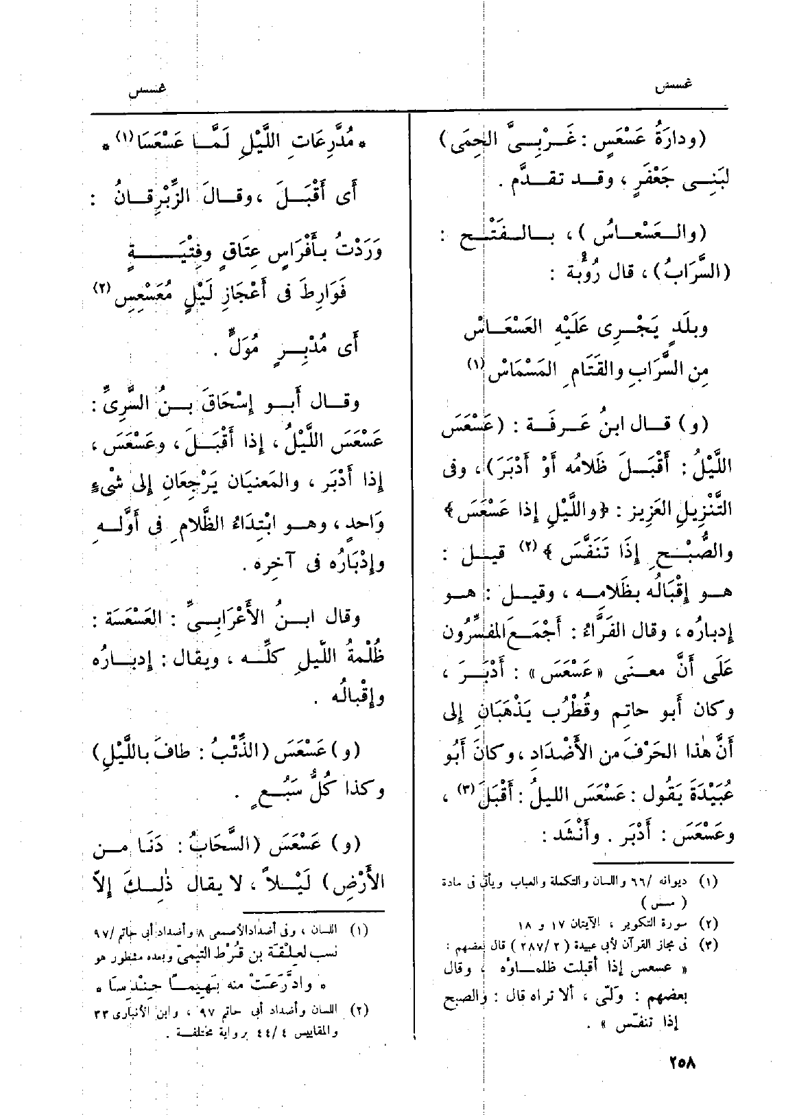 وَقَالَ ابنُ عَرَفة: {عَسْعَسَ اللَّيْلُ: أَقْبَلَ ظَلامُه أَو أَدْبَرَ، وَفِي التّنْزِيلِ العَزِيز: واللَّيْلِ إِذا عَسْعَس والصُّبْحِ إِذا تَنَفَّسَ قيل: هُوَ إِقْبَالُه بظَلامِه، وَقيل: هُوَ إِدْبارُه، وَقَالَ الفَرَّاءُ: أَجْمَعَ المفسِّرُون عَلَى أنَّ معنى عَسْعَسَ: أَدْبَرَ، وَكَانَ أَبو حاتِم وقُطْرُب يَذْهَبَانِ إِلَى أنَّ هَذَا الحَرْفَ من الأَضْدَادِ، وكانَ أَبُو عُبَيْدَةَ يَقُول: عَسْعَسَ الليلُ أَقْبلَ،} وعَسْعَسَ: أَدْبَر. وأَنْشَد: مُدَّرِعاتِ اللَّيْلِ لَمَّا {عَسْعَسْا أَي أَقْبَلَ، وقالَ الزِّبْرِقانُ:
