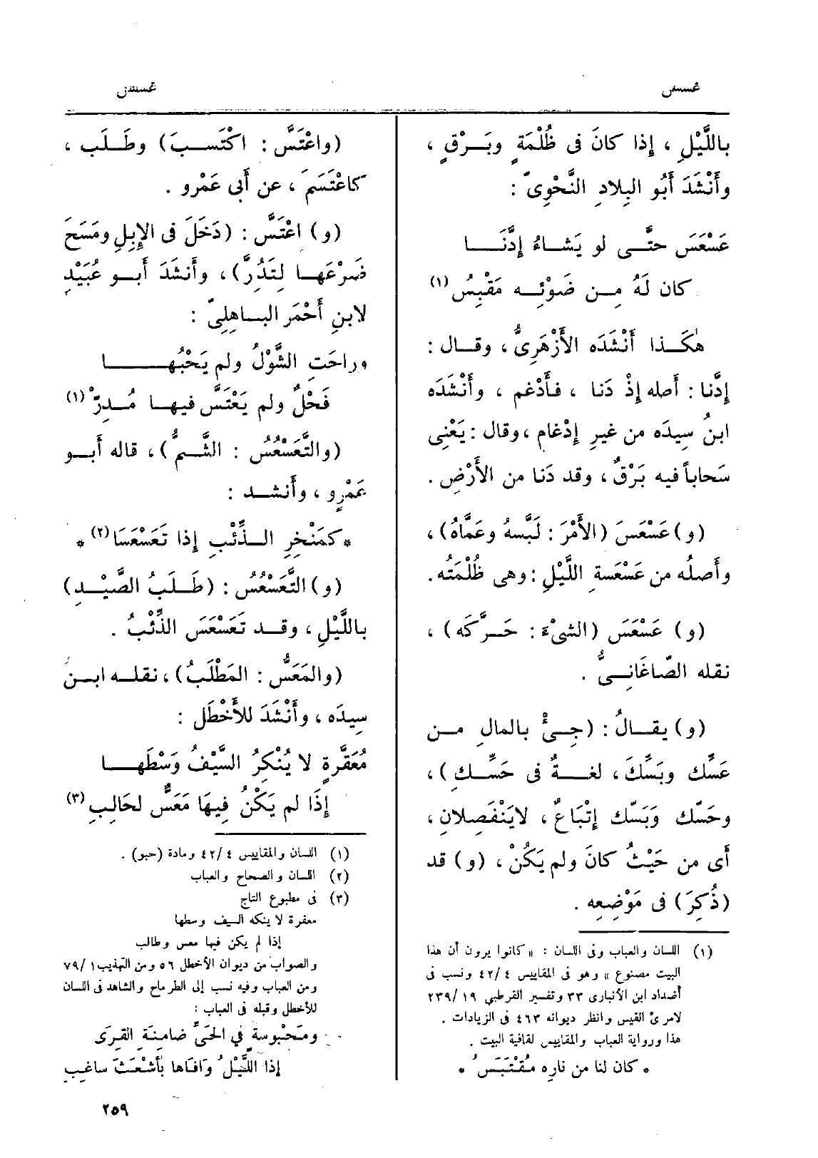 هكَذا أَنْشَدَه الاَزْهَرِيُّ، وَقَالَ: إِدَّنا: أَصله إِذ دَنا، فأَدْغم، وأَنْشَدَه ابنُ سِيدَه من غيرِ إِدغام، وَقَالَ يَعْنِي سَحاباً فِيهِ بَرْقٌ، وَقد دَنا من الأَرْضِ. وعَسْعَسَ الأَمْرَ: لَبَّسهُ وعَمَّاهُ، وأَصْلُه من عَسْعَسَةِ الشيءَ: حَرَّكه، نَقله الصّاغَانِيُّ. ويقالُ: جِئْ بالمالِ من} عَسِّك وبَسِّك، لغةٌ فِي حَسِّكِ، وحَسّك وبَسّك إِتْبَاعٌ، لَا يَنْفَصِلانِ أَي من حَيْثُ كانَ وَلم يَكُنْ، وَقد ذُكِرَ فِي مَوْضِعِه. {واعْتَسَّ: اكْتَسَبَ وطَلَب، كاعْتَسَمَ، عَن أَبِي عمْرو. (و) } اعْتَسَّ دَخَلَ فِي الإِبِلِ ومَسَحَ ضَرْعَها لِتَدُرَّ، وأِنْشَدَ أَبو عُبَيْد لابنِ أَحْمَر الباهِليّ: