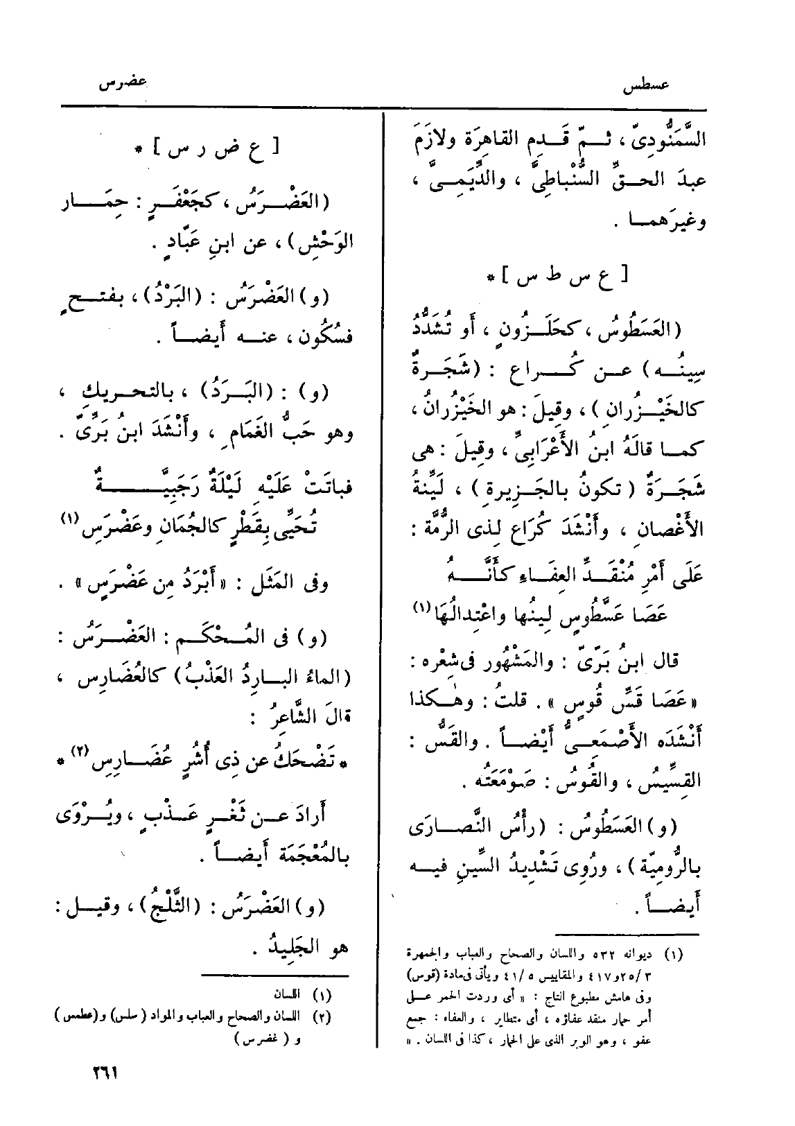 العَضْرَسُ، كجَعْفَرٍ: حِمَار الوَحْشِ، عَن ابنِ عَبّادٍ. والعَضْرَسُ: البَرْدُ، بفتحٍ فسُكُون، عَنهُ أَيضاً. و: البَرَدُ، بِالتَّحْرِيكِ، وَهُوَ حَبُّ الغَمَامِ، وأَنْشَدَ ابنُ بَرِّيّ.