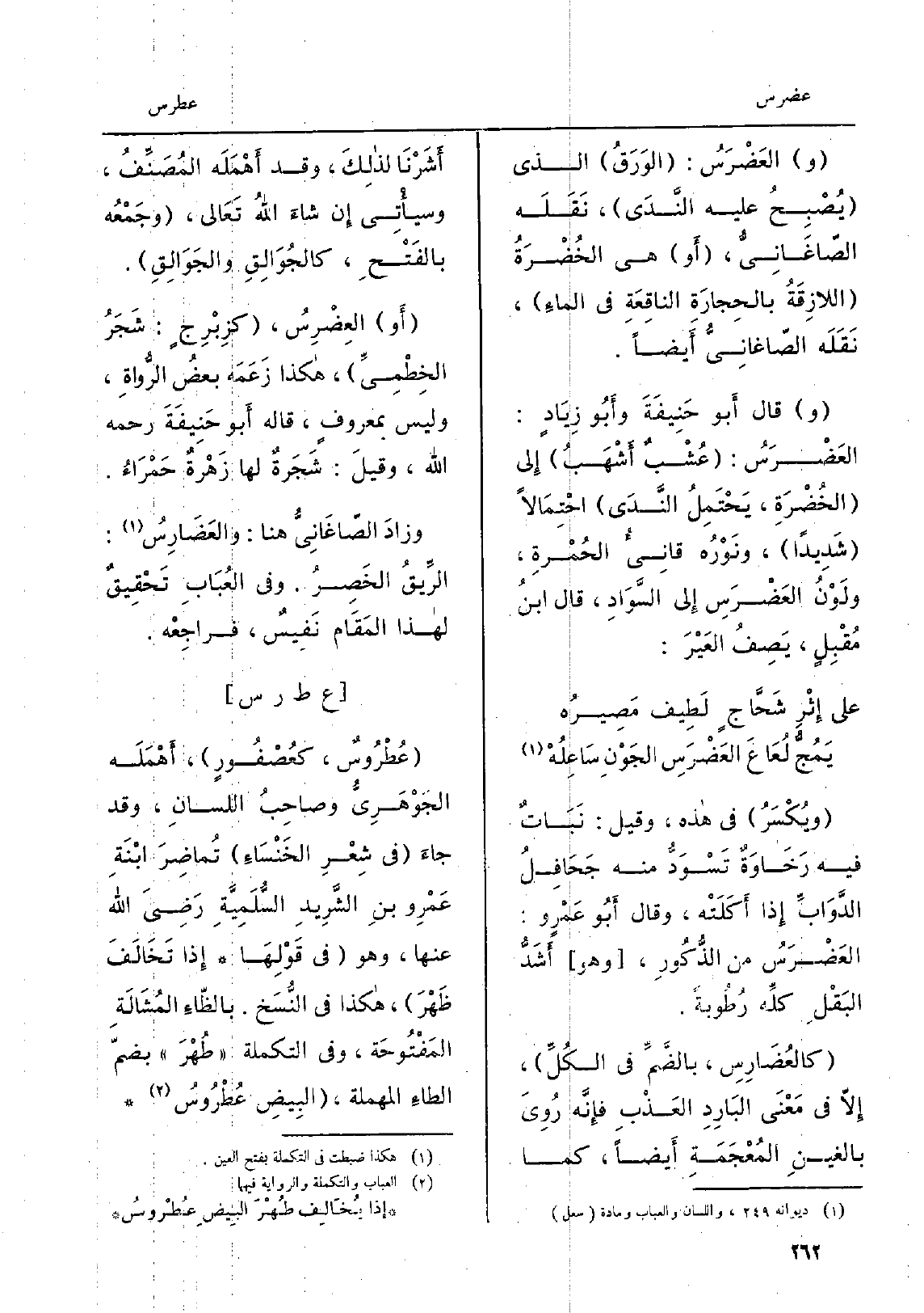 ويُكْسَرُ فِي هَذِه، وَقيل: نَبَاتٌ فِيهِ رَخاوَةٌ تَسُوَدُّ مِنْهُ جَحَافِلُ الدَّوَابِ إِذا أَكَلَتْهُ، وَقَالَ أَبُو عَمْرٍ و: العَضْرَسُ من الذُّكُورِ، وَهُوَ أَشَدُّ البَقْلِ كلِّه رُطُوبةً. كالعُضَارِسِ، بالضَّمِّ فِي الكُلِّ، إِلاّ فِي مَعْنَى البَارِدِ العَذْبِ فإِنَّه رُوِيَ بالغينِ المُعْجَمَةِ أَيضاً، كَمَا أَشَرْنَا لذلِكَ، وَقد أَهْمَلَه المُصَنِّفُ، وسيأْتِي إِن شاءَ الله تَعَالى، وجَمْعُه بالفَتْحِ، كالجُوَالِقِ والجَوَالِقِ. أَو العِضْرِسُ، كزِبْرِجٍ: شَجَرُ الخِطْمِيِّ، هَكَذَا زَعَمَه بعضُ الرُّواةِ، وَلَيْسَ بمعروفٍ، قَالَه أَبو حَنِيفَةَ رَحمَه الله، وقيلَ: شَجَرةٌ لَهَا زَهْرَةٌ) حَمْرَاءُ. وزادَ الصّاغَانِيُّ هُنَا: والعَضَارِسُ: الرِّيقُ الخَصِرُ. وَفِي العُبَابِ تَحْقِيقٌ لهَذَا المَقَام نَفِيسٌ، فراجِعْه.