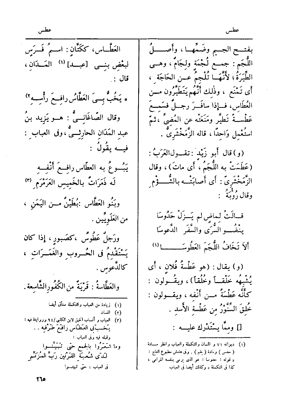 أَلاَ تَخَافُ اللُّجَمَ العَطُوسَا وَيُقَال: هُوَ عَطْسةُ فُلانٍ، أَي يُشْبِهُه خَلْقَاً وخُلُقاً، ويقُولون: كأَنَّه عَطْسَةٌ من أَنْفِه، ويقُولون: خُلِقَ السِّنَّوْرُ مِن عَطْسةِ الأَسدِ. ومِمَّا يسْتَدْرك عَلَيْهِ: العَطَّاس، ككَتانٍ: اسمُ فَرَسٍ لبعْضِ بنِي عبد المَدَانِ، قَالَ: يَخُبُّ بِيَ العَطَّاسُ رافِعَ رأْسِهِ، وَقَالَ الصّاغَانِيُّ: هُوَ يَزِيد بنُ عبدِ المَدَانِ الحارِثِيُّ، وَفِي العبابِ: فِيهِ يقُولُ: