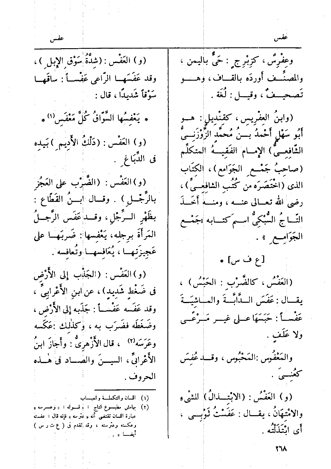 العَفْسُ، كالضَّرْبِ: الحَبْسُ، يُقَال: عَفَسَ الدَّابَّةَ والماشِيَةَ عَفْساً: حَبَسَهَا على غير مَرْعىً وَلَا عَلَفٍ. والمَعْفُوس: المَحْبُوس، وَقد عُفِسَ كعُنِيَ. والعَفْسُ: الابْتِذالُ للشيءِ والامْتِهَانُ، يُقَال: عَفَسْتُ ثَوْبِي، أَي ابْتَذَلْتُه. والعَفْس: شِدَّةُ سَوْقِ الإِبلِ، وَقد عَفَسَها الرّاعِي عَفْساً: ساقَها سَوْقاً شَدِيداً، قَالَ:، يَعْفِسُها السَّوّاقُ كُلَّ مَعْفَسِ. والعَفْس: دَلْكُ الأَدِيمِ بيَدِه فِي الدِّبَاغِ. والعَفْس: الضَّرْب على العَجُزِ بالرِّجْلِ. وَقَالَ ابنُ القَطّاع: بظَهْرِ الرِّجْلِ. وَقَالَ ابنُ القَطّاع: بظَهْرِ الرِّجْلِ، وَقد عَفَس الرَّجلُ المَرْأَةَ برِجلِه، يَعْفِسها: ضَرَبَها على عَجِيزَتِها، يُعَافِسها وتُعافِسه. والعَفْس: الجَذْب إِلى الأَرْضِ فِي ضَغْطٍ شَدِيدٍ، عَن ابنِ الأَعْرابِيِّ، وَقد عَفَسه عَفْساً: جَذَبه إِلى الأَرْضِ، وضَغَطَه فضَرَب بِهِ، وكذلِك: عَكَسه وعَرَسه، قَالَ الأَزْهَرِيُّ: وأَجازَ ابنُ الأَعْرابيِّ، السينَ وَالصَّاد فِي هَذِه الْحُرُوف.