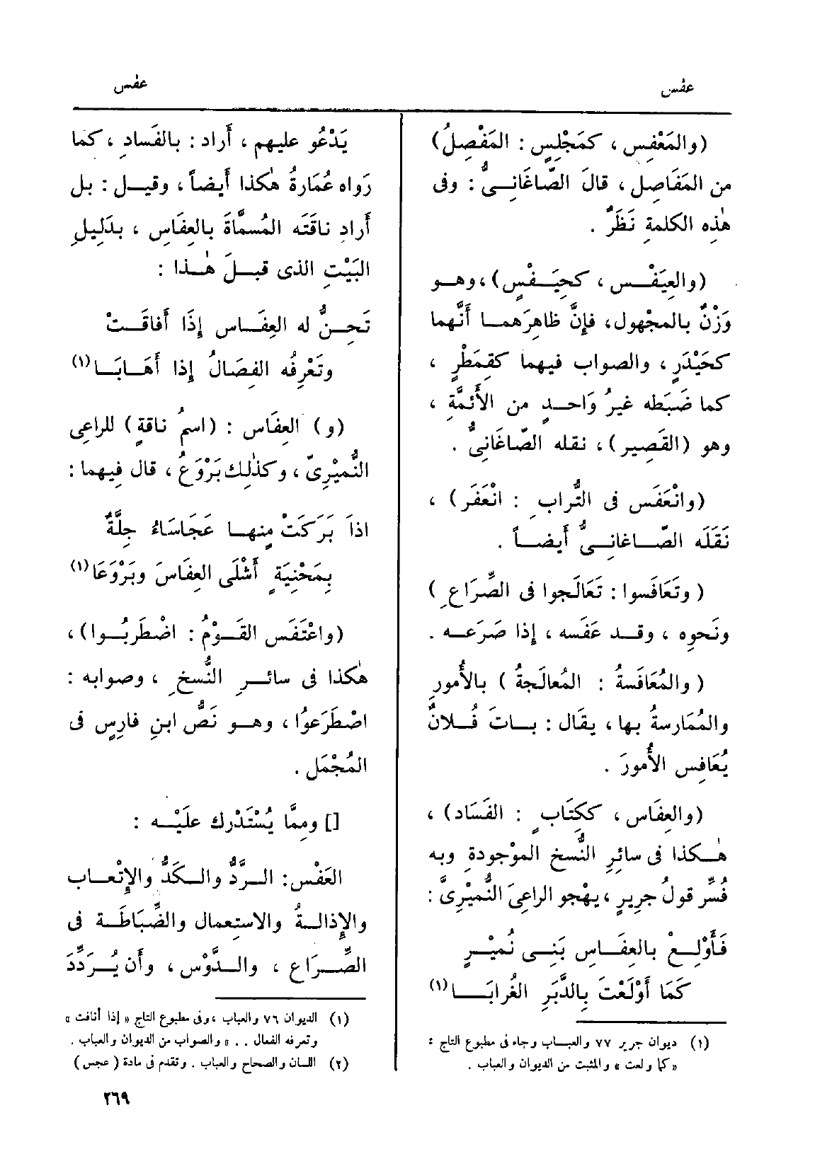 والعِفَاس: اسمُ ناقةٍ للراعِي النُّميْرِيّ، وكذلِك بَرْوَعُ، قَالَ فِيهما: إِذا بَرَكَتْ مِنْهَا عَجَاسَاءُ جِلَّةٌ بِمَحْنِيَةٍ أَشْلَى العِفَاسَ وبَرْوَعَا واعْتَفَس القَوْمُ: اضْطَربُوا، هَكَذَا فِي سائِرِ النُّسخِ، وَصَوَابه: اصْطَرَعُوا، وَهُوَ نَصُّ بانِ فارِسٍ فِي المُجْمَل. ومِمَّا يُسْتَدْرك عَلَيْه: العَفْس: الرَّدُّ والكَدُّ والإِتْعاب والإِذالةُ والاستِعمال والضِّباطَة فِي الصِرَاع، والدَّوْس، وأَن يُرَدِّد