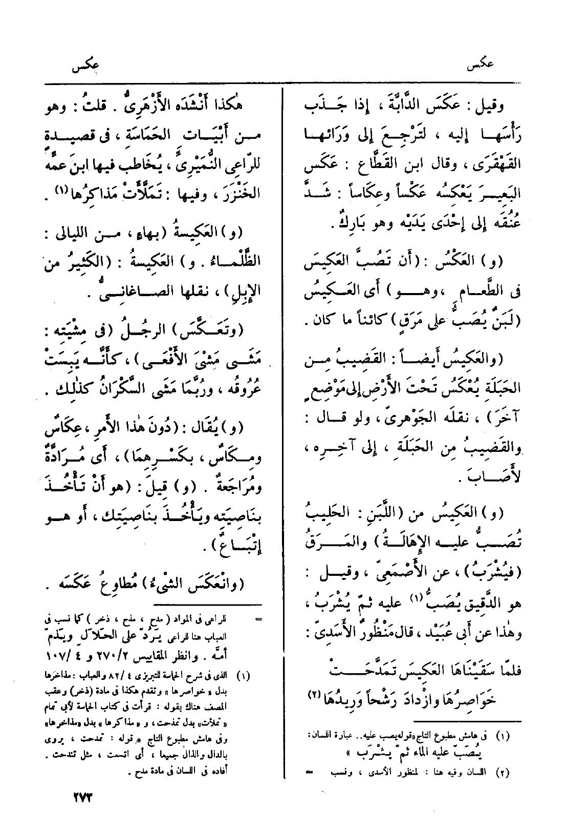 هَكَذَا أنشَدَه الأَزْهَرِيُّ. قلتُ: وَهُوَ من أَبْيات الحَمَاسَةِ، فِي قَصيدةٍ للرّاعِي النُّمَيْرِيِّ، يُخَاطَب فِيهَا ابنَ عمِّه الخَنْزَرَ، وفيهَا: تَمَلأَّتْ مَذاكِرُها. والعَكِيسةُ بهاءٍ، من اللَّيَالِي: الظَّلْماءُ. والعَكِيسةُ: الكَثِيرُ من الإِبِلِ، نقلهَا الصّاغَانِيُّ. وتَعَكَّسَ الرجُلُ فِي مِشْيَتِه: مَشَى مَشْيَ الأَفْعى، كأَنَّه يَبِسَتْ عُرُوقُه، ورُبَّمَا مَشَى السَّكْرَانُ كذلِك. ويُقَال: دُونَ هَذَا الأَمرِ، عِكَاسٌ ومِكَاسٌ، بكَسْرِهِمَا، أَي مُرَادَّةٌ ومُرَاجَعةٌ. وقِيلَ: هُوَ أَنْ تَأْخُذَ بنَاصِيَتِه ويأْخُذَ بنَاصِيَتِك، أَو هُوَ إِتْبَاعٌ. وانعَكَسَ الشيءُ) مُطاوِعُ عَكَسَهُ.