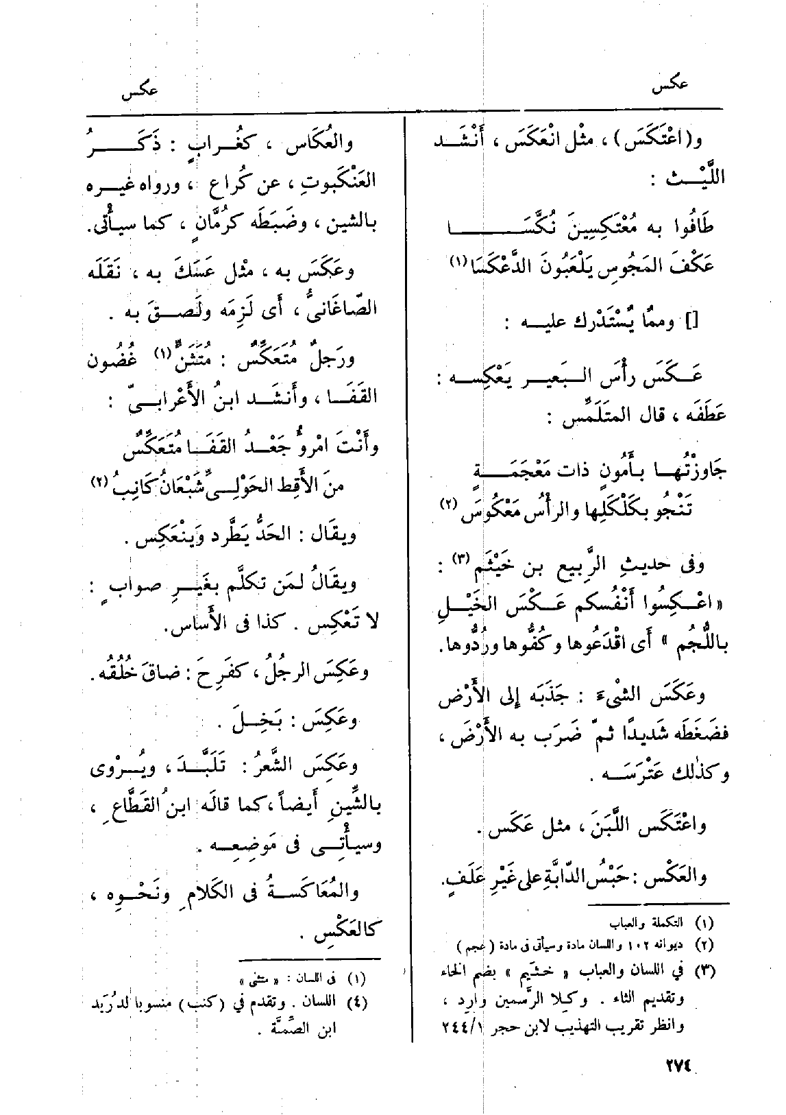 واعْتَكَس اللَّبَنَ، مثل عَكَسَ. والعَكْس: حَبْسُ الدّابََّةِ على غَيْرِ عَلَفٍ. والعُكَاس، كغُرابٍ: ذَكَرُ العَنْكَبوتِ، عَن كُراع، وَرَوَاهُ غَيره بالشين، وضَبَطَه كرٌُ مّانٍ، كَمَا سيأْتِي. وعَكَسَ بِهِ، مثل عَسَكَ بِهِ، نَقَلَه الصّاغَانِيُّ، أَي لَزِمَه ولَصقَ بِهِ. ورَجلٌ مُتَعَكِّسٌ: مُتَثَنٍّ غُضُون القَفَا، وأَنشَد ابنُ الأَعْرابيّ: