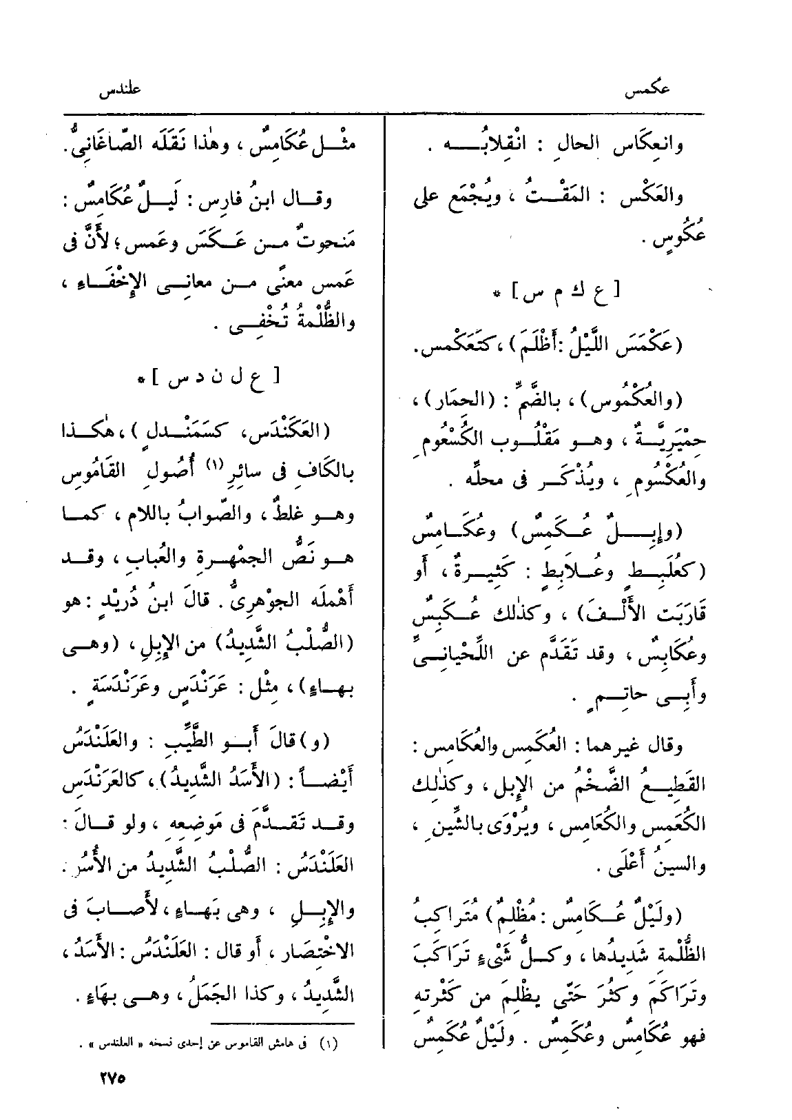 عَكْمَسَ اللَّيْلُ: أَظْلَمَ، كتَعَكْمس. والعُكْمُوس، بالضَّمِّ: الحِمَار، حِمْيَرِيَّةٌ، وَهُوَ مَقْلُوب الكُسْعُومِ والعُكْسُومِ، ويُذْكَر فِي محلِّه. وإِبِلٌ عُكَمِسٌ وعُكَامِسٌ كعُلَبِطٍ وعُلاَبِطٍ: كَثِيرةٌ، أَو قَارَبَت الأَلْفَ، وَكَذَلِكَ عُكَبِسٌ وعُكَابِسٌ، وَقد تَقَدَّم عَن اللِّحْيانِيِّ وأَبِي حاتِمٍ. وَقَالَ غَيرهمَا: العُكَمِس والعُكَامِس: القَطِيعُ الضَّخمُ من الإِبل، وكذلِك الكُعَمِس والكُعَامِس، ويُروَى بالشِّينِ، والسينُ أَعْلَى. ولَيْلٌ عُكَامِسٌ: مُظْلِمٌ مُتَراكِبُ الظُّلْمةِ شَدِيدُها، وكُلُّ شَيٍْ تَرَاكَبَ وتَرَاكَمَ وكثُرَ حَتّى يظْلِمَ من كَثْرتهِ فَهُوَ عُكَامِسٌ وعُكَمِسٌ. ولَيْلٌ عُكَمِسٌ مثل عُكَامِسٌ، وَهَذَا نَقَلَه الصّاغَانِيُّ. وَقَالَ ابنُ فارِس: لَيْلٌ عُكَامِسٌ: مَنْحوتٌ من عَكَسَ وعَمس، لأَنَّ فِي عَمس معنى من معانِي الإِخْفَاءِ، والظُّلْمةُ تُخْفِي.