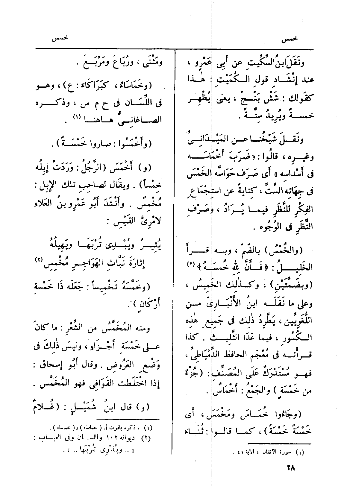 ونَقَلَ ابنُ السِّكِّيتِ عَن أَبِي عُمْروٍ، عِنْد إِنْشَادِ قولِ الكُمَيْتِ: هَذَا كقَولك: شَشْ بَنْجْ، يَعْنِي يُظْهِر خَمْسَة ويُرِيدُ سِتَّةً. ونَقلَ شَيْخُنا عَن المَيْدَانِيِّ وغيرِه، قالُوا ضَرَبَ أَخْماسَه فِي أَسْداسِه أَي صَرَف حَوَاسَّه الخَمْسَ فِي جِهَاتِه السِّتِّ، كِنايةً عَن استِجْمَاعِ الفِكْرِ للنَّظَرِ فِيمَا يُرَادُ، وصَرْفِ النَّظَرِ فِي الوُجُوه. والخُمْسُ بالضّمّ، وَبِه قرأَ الخِليلُ: فَأَنَّ للهِ خُمَسهُ وبضَمَّتَيْنِ، وكذلِك الخَمِيسُ، وعَلى مَا نَقَلَه ابنُ الأَنْبَارِيّ من اللُّغَوِيِّين، يَطَّرِدُ ذلِك فِي جَمِيعِ هذِه الكُسُورِ، فِيمَا عَدَا الثَّلِيث. كَذَا قرأْته فِي مُعْجَم الْحَافِظ الدِّمْيَاطِيِّ، فَهُوَ مُسْتَدْرَكٌ عَلَى المُصَنِّفِ: جُزْءٌ من خَمْسَةٍ والجَمْعُ: أَخْمَاسٌ. وجَاءُوا خُمَاسَ ومَخْمَسَ، أَي خَمْسَةً خَمْسَةً، كَمَا قَالُوا: ثُنَاءَ ومَثْنَى، ورُباعَ ومَرْبَعَ. وخَمَاسَاءُ، كَبَراكَاءَ: ع، وَهُوَ فِي اللِّسَان فِي ح م. س، وَذكره الصاغانِيُّ هَا هُنَا.