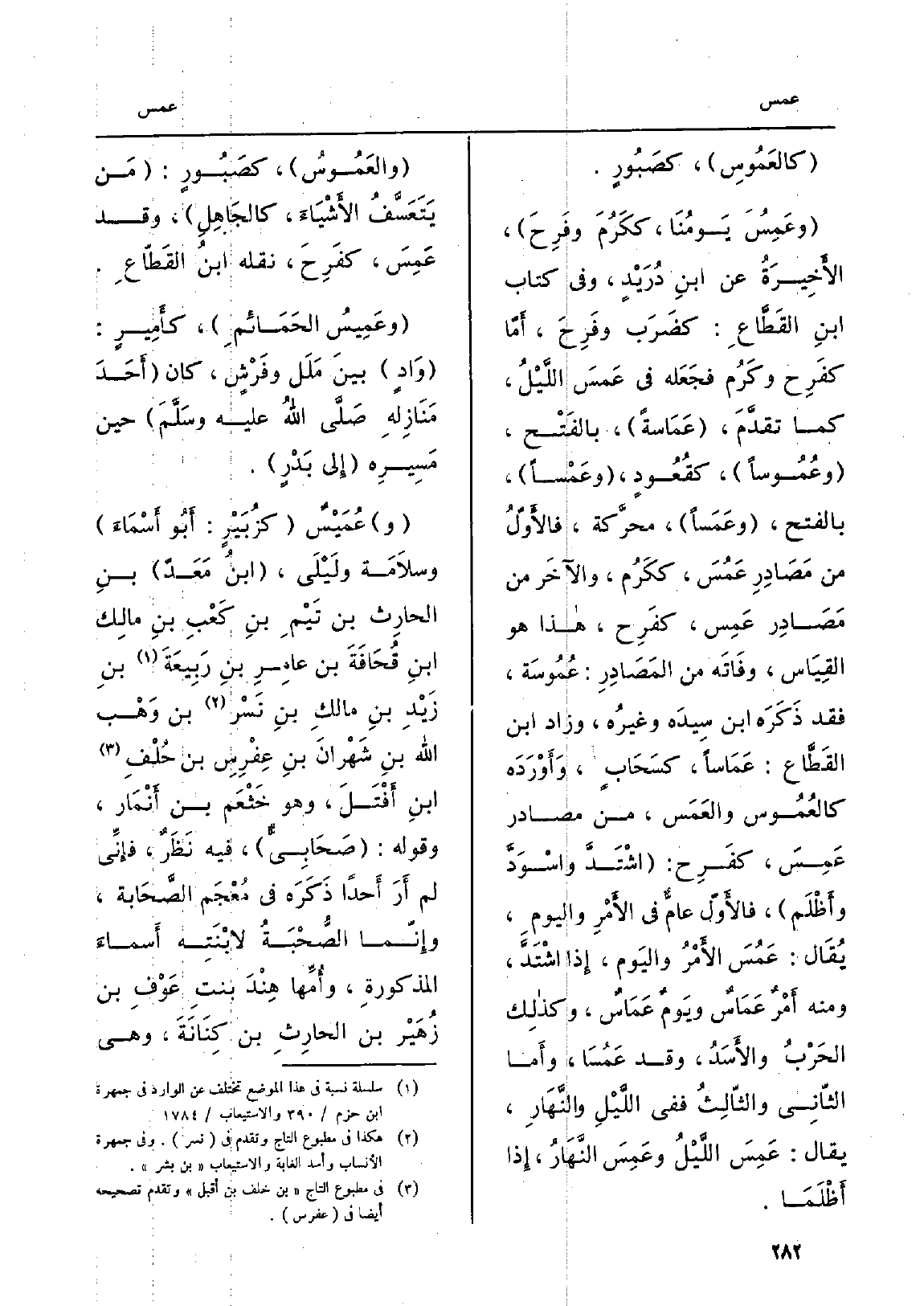 كالعَمُوسِ، كصَبُورٍ. وعَمِسُ يَومُنَا، ككَرمَ وفَرِحَ، الأَخِيرَةُ عَن ابنِ دُرَيْدٍ، وَفِي كتاب ابنِ القَطَّاعِ: كضَرَب فَرِحَ، أَمّا كفَرِح وكَرُم فجَعَله فِي عَمسَ اللَّيْلُ، كَمَا تقدَّمَ، عَمَاسةً، بالفَتْح، وعُمُوساً، كقُعُودٍ، وعَمْساً، بِالْفَتْح، وعَمَساً، محرَّكة، فالأَوّلُ من مَصَادِرِ عَمُسَ، ككَرُم، والآخَر من مَصَادِر عَمِس، كفَرِح، هَذَا هُوَ القِيَاس، وفَاتَه من المَصَادِرِ: عُمُوسَة، فقد ذَكَرَه ابْن سِيدَه وغيرُه، وَزَاد ابْن القَطَّاع: عَمَاساً، كسَحَابٍ، وأَوْرَدَه كالعُمُوس والعَمَس، من مصَادِر عَمِسَ، كفرح اشْتَدَّ وسود وأظلم فالأَوّل عامٌّ فِي الأَمْرِ واليومِ، يُقَال: عَمُسَ الأَمْرُ واليومَ، إِذا اشْتَدَّ، وَمِنْه أَمْرٌ عَمَاس ويَوْمٌ عَمَاسٌ، وكذلِك الحَرْبُ والأَسَدُ، وَقد عَمُسَا، وأَما الثّانِي والثّالِثُ فَفِي اللَّيْلِ والنَّهَارِ، يُقال: عَمِسَ اللَّيْلُ وعَمِسَ النَّهَارُ، إِذا أَظْلَمَا، والعَمُوسُ، كصَبُورٍ: مَن يَتَعَسَّفُ الأَشْيَاءَ، كالجَاهِلِ، وَقد عَمِسَ، كفَرِحَ، نَقله ابنُ القَطّاعِ. وعَمِيسُ الحَمَائِمِ، كأَميرٍ: وَادٍ بينَ مَلَل وفَرْشٍ، كَانَ أَحَدَ مَنَازِلِهِ صَلَّى اللهُ عَلَيْهِ وسَلَّمَ حينَ مَسِيرِه إِلى بَدْرٍ. وعُمَيْسٌ كزُبَيْرٍ: أَبُو أَسْمَاءَ وسلاَمَة ولَيْلَى، ابنُ مَعَدّ بنِ الحارِث بن تميمِ بنِ كَعْبِ بنِ مالِك ابنِ قُحَافَةَ بن عامِرِ بنِ رَبيِعَةَ بنِ زَيْدِ بنِ مالِكِ بنِ نَسْرِ بن وَهْب الله بنِ شَهْرانَ بنِ عِفْرِسِ بن خُلْفٍ ابنِ أَفْتَلَ، وَهُوَ خَثْعَم بن أَنْمار، وَقَوله: صَحَابِيٌّ، فِيهِ نَظَرٌ، فإنِّي لم أَرَ أَحداً ذَكَرَه فِي مُعْجَم الصَّحَابة، وإِنّما الصُّحْبَةُ)