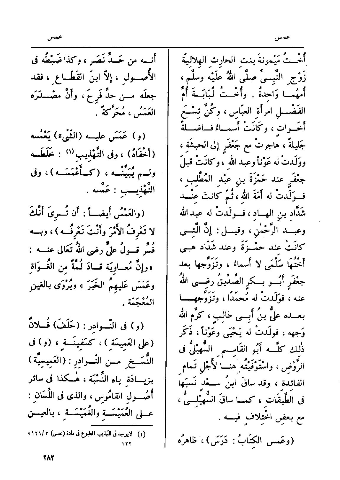 أُخْتُ مَيمونةَ بنتِ الحارِثِ الهِلاليّة زَوْجِ النَّبِيِّ صلَّى اللهُ علَيْه وسلّم، أُمُهُما وَاحِدةٌ. وأُخْتُ لُبَابَةَ أُمِّ الفَضْلِ امرأَةِ العبّاسِ، وكُنَّ تِسْعَ أَخَواتٍ، وكَانَتْ أَسْماءُ فاضلةً جَليلةً، هاجرتْ مَعَ جَعْفَرٍ إِلى الحبشَةِ، ووَلَدتْ لَهُ عَوْناً وَعبد اللهِ، وكانَتْ قبلَ جعْفَرٍ عِنْد حَمْزَةَ بنِ عبْدِ المُطَّلِبِ، فوَلَدتْ لَهُ أَمَةَ اللهِ، ثُمَّ كَانَت عِنْد شَدَّادِ بنِ الهادِ، فولَدتْ لَهُ عبد الله وَعبد الرَّحْمنِ، وَقيل: إِنَّ الَّتِي كانَتْ عِنْد حمْزَةَ وَعند شَدّاد هِيَ أخْتُهَا سَلْمَى لَا أَسماءُ، وتَزَوَّجها بعد جعْفَرٍ أَبُو بكرٍ الصَّدِّيقُ رضِي اللهُ عَنهُ، فوَلَدتْ لَهُ مُحمّداً، وتَزَوَّجها بعده عليُّ بنُ أَبِي طالِبٍ، كرَّم الله وَجهه، فولَدتْ لَهُ يَحْيَى وعَوْناً، ذَكَر ذلِك كلَّه أَبُو القَاسِمِ السُّهيْلِيُّ فِي الرَّوْضِ، واسْتَوْفَيْتُه عَنْهَا لأَجْلِ تَمامِ الفائِدةِ، وَقد ساقَ ابنُ سعْدٍ نَسَبَها فِي الطَّبَقاتِ، كَمَا ساقَ السُّهيْلِيُّ، مَعَ بعضِ اخْتِلافٍ فِيهِ. وعَمس الكِتَابُ: دَرَسَ، ظاهرُه أَنه من حَدِّ نَصَر، وَكَذَا ضَبْطُه فِي الأُصولِ، إِلاّ ابنَ القَطّاعِ، فقد جعلَه من حدِّ فَرِحَ، وأَنَّ مصْدَرَه العَمَسُ، مُحَرَّكةً. عَمَسَ عَلَيْهِ الشّيءَ يَعْمُسه أَخْفَاهُ، وَفِي التَّهْذِيبِ: خَلَطَه وَلم يُبَيِّنْه، كأَعْمَسَه، وَفِي التَّهْذِيبِ: عَمَّسه. والعَمْسُ أَيضاً: أَن تُرِيَ أَنَّكَ لَا تَعْرِفُ الأَمْرَ وأَنْتَ تَعْرِفُهُ، وَبِه فُسِّر قولُ عليٍّ رَضِي اللهُ تَعَالى عَنهُ: وإِنَّ مُعاوِيَة قادَ لُمَّةً مِن الغُوَاةِ وعَمَسَ عَليهِمُ الخَبَرَ ويُرْوَى بالغينِ المُعْجَمَة. وَفِي النّوادِر: حَلَفَ فُلانٌ على العَمِيسَةِ، كسَفِينَةٍ، وَفِي النُّسَخِ من النَّوادِرِ: العَمِيسِيَّة بزيادَةِ ياءٍ النِّيسْبَة، هَكَذَا فِي سَائِر أُصُولِ القامُوسِ، وَالَّذِي فِي اللِّسَانِ: على العُمَيْسَةِ والغُمَيْسَةِ، بِالْعينِ
