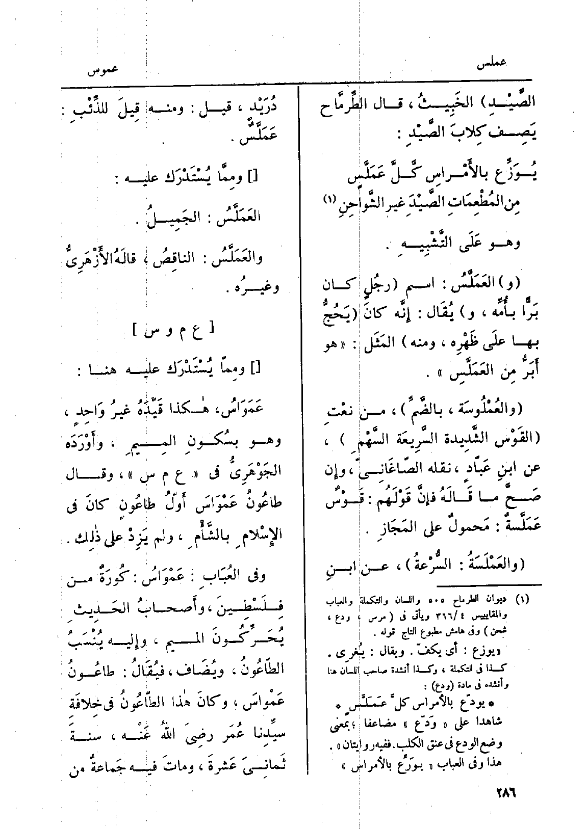 وَفِي العُبَابِ: عَمْوَاسُ: كُورَةٌ من فِلَسْطِينَ، وأَصْحابُ الحَدِيثِ يُحَرِّكُونَ الْمِيم، وإِليه يُنْسَبُ الطَّعُونُ، ويُضَاف، فيُقَالُ: طاعونُ عَمْواسَ، وكانَ هَذَا الطّاعُونُ فِي خِلافَةِ سيِّدِنا عُمَر رضِيَ اللهُ عَنْه، سنةَ ثَمانِيَ عَشْرةَ، وماتَ فِيهِ جَماعةٌ من
