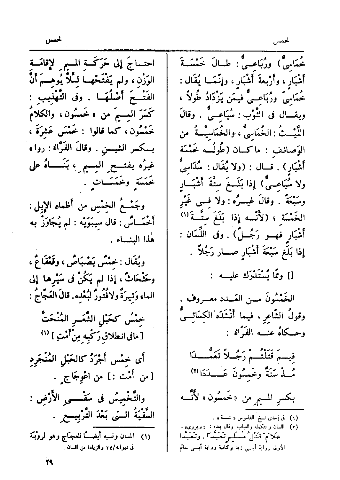بكسرِ الميمِ من خَمسُون لأَنَّه احتاجَ إِلى حَرَكَةِ الميمِ لإِقامَةِ الوَزْنِ، وَلم يَفْتَحْها لِئَلاَّ يُوهِمَ أَنَّ الفَتْحَ أَصْلُهَا. وَفِي التَّهْذِيبِ: كَسَرَ الميمَ من خَمسُون، والكلامُ خَمْسُون، كَمَا قَالُوا: خَمْسَ عَشِرَةَ، بِكَسْر الشينِ. وقالَ الفَرَّاءُ: رَوَاهُ غيرُه بفتحِ المِيمِ، بَنَاهُ على خَمَسَةٍ وخَمَسَاتٍ. وجَمْعُ الخِمْسِ من أَظْماءِ الإِبل: أَخْمَاسٌ: قَالَ سِيبَوَيْه: لم يُجَاوَزْ بِهِ هَذَا الْبناء. ويُقَال: خِمْسٌ بَصْبَاصٌ، وقَعْقَاعٌ، وحَثْحَاثٌ، إِذا لم يَكُنْ فِي سَيْرِها إِلَى الماءِ وَتِيرَةٌ وَلَا فُتُورٌ لبُعْدِه. قالَ العَجّاجُ: خِمْسٌ كحَبْلِ الشَّعَرِ المُنْحَتِّ مَا فِي انطلاقِ رَكْبِهِ مِنْ أَمْتِ أَي خِمسْ أَجْرَدُ كالحَبْلِ المُنْجَرِدِ من أَمْت: من اعْوِجَاجٍ. والتَّخْمِيسُ فِي سَقْيِ الأَرْضِ: السَّقْيَةُ الَّتِي بَعْدَ التَّرْبِيعِ.