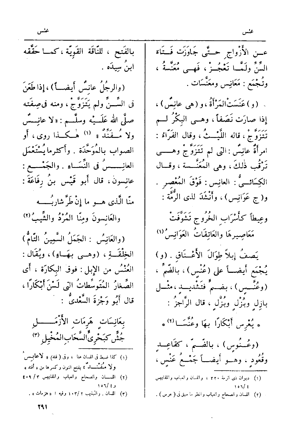 يَصِفُ إِبلاً طِوَالَ الأَعْنَاقِ. ويُجْمَع أَيْضاً على عُنْسٍ، بالضّمِّ، وعُنَّسٍ، بضمٍّ فتَشْدِيدٍ، مثْل بازِلٍ وبُزْلٍ وبُزَّلٍ، قَالَ الرَّاجِزُ: يُعْرِس أَبْكَاراً بهَا وعُنَّسَا وعُنُوسٍ، بالضَّمِّ، كقَاعِدٍ وقُعُودٍ، وَهُوَ أَيْضاً جَمْعُ عَنْسٍ، بالفَتْح، للنّاقَة القَوِيَّة، كَمَا حَقَّقه ابنُ سِيدَه. والرجُلُ عانِسٌ أَيضاً، إِذا طَعَنَ فِي السِّنِّ وَلم يَتَزَوَّجْ، وَمِنْه فِي صِفَته صلَّى الله عَلَيْه وسلَّم: لَا عانِسٌ وَلَا مُفَنِّدٌ هَكَذَا روى، أَو الصَّوَاب بالمُوَحَّدَة. وأَكثر مَا يُسْتَعْمَل العانِسُ فِي النِّسَاءِ. والجَمْع: عانِسُون، قَالَ أَبو قَيْس بنُ رِفَاعَةَ: منّا الَّذِي هُوَ مَا إِنْ طَرَّ شارِبُه والعَانِسُونَ ومِنَّا المُرْدُ والشِّيبُ والعَانِسُ: الجَمَلُ السَّمِينُ التّامُّ الخِلْقَةِ، وَهِي بهَاءٍ، ويُقَال: العُنْسُ من الإِبل: فَوق البِكارَة، أَي الصِّغارُ المُتَوسِّطاتُ الَّتِي لَسْنَ أَبْكَاراً، قَالَ أَبو وَجْزةَ السَّعْدِيُّ: