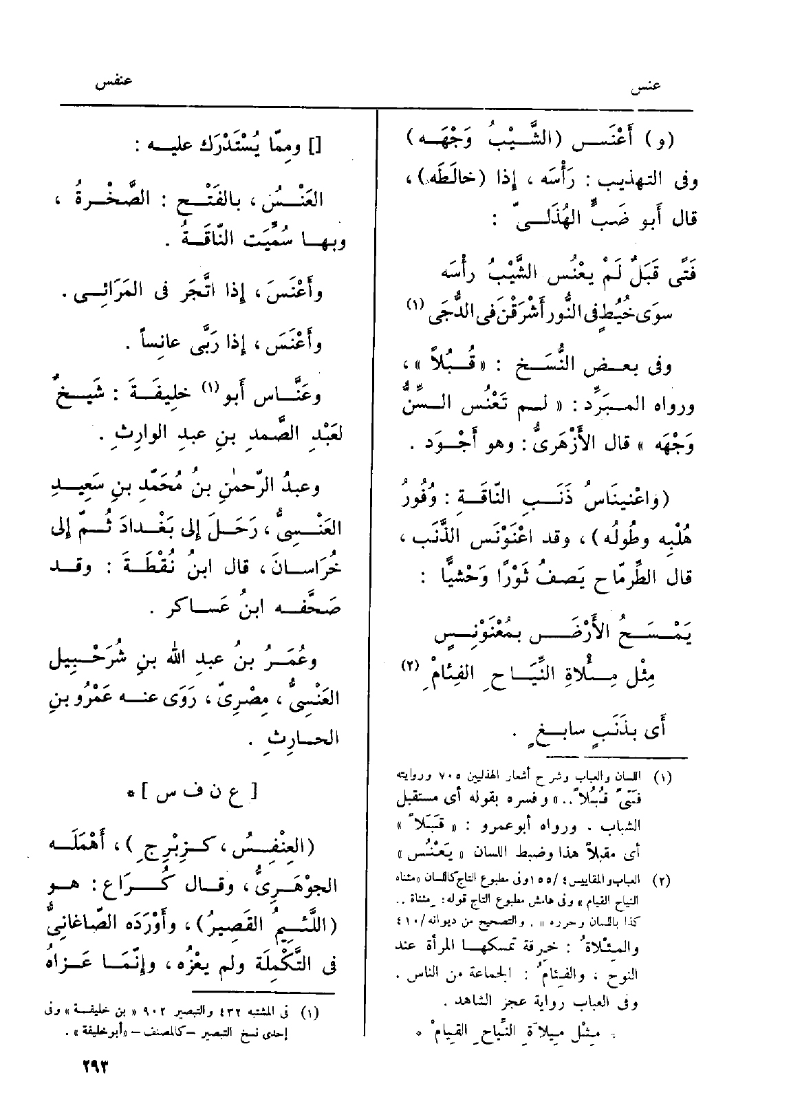 أَي بِذَنَبٍ سابغٍ. ومِمّا يُسْتَدْرَك عَلَيْهِ: العَنْسُ، بالفَتْح: الصَّخْرةُ، وَبهَا سُمِّيَت النّاقَةُ. وأعْنَسَ، إِذا اتَّجَر فِي المَرَائِي. وأَعْنَسَ، إِذا رَبَّى عانِساً. وعَنَّاس أَبو خلِيفَةَ: شَيخٌ لعَبْدِ الصَّمدِ بن عبدِ الوارِثِ. وعبدُ الرّحمنِ بنُ مُحَمَّدِ بنِ سَعِيدِ العَنْسِيُّ، رَحَلَ إِلى بَغْدادَ ثُمّ إِلى خُرَاسانَ، قَالَ ابنُ نُقْطَةَ: وَقد صَحَّفه ابنُ عَساكر. وعُمَرُ بنُ عبدِ الله بنِ شُرَحْبِيل العَنْسِيُّ، مِصْرِيّ، رَوَى عَنهُ عَمْرُو بنِ الحارِثِ.