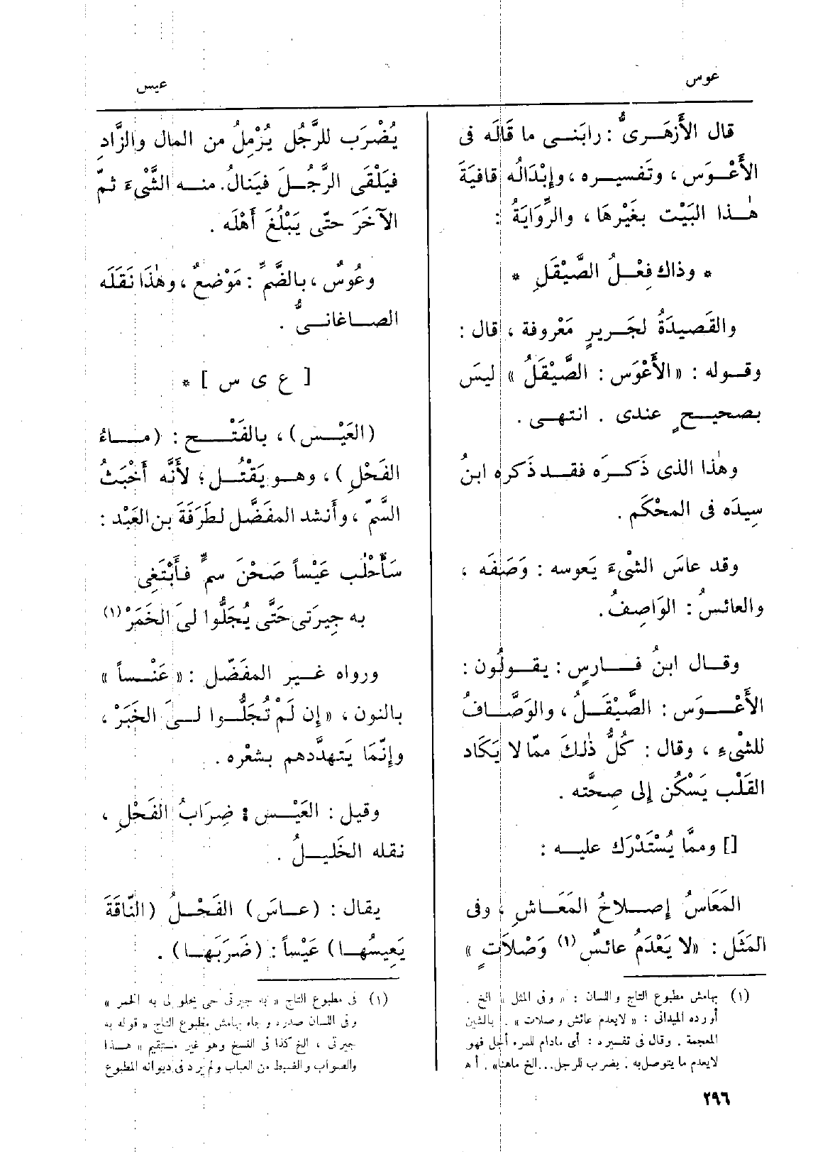 والقَصِيدَةُ لجَريرٍ مَعْروفة، قَالَ: وَقَوله: {الأَعْوَس: الصَّيْقَلُ ليسَ بصحيحٍ عِنْدِي. انْتهى. وَهَذَا الَّذِي ذَكرَه فقد ذَكره ابنُ سِيدَه فِي المحْكَم. وَقد} عاسَ الشيْءَ {يَعوسه: وَصَفَه،} والعائِسُ: الوَاصفُ. وَقَالَ ابنُ فارسٍ: يقولُون: الأَعْوَسُ: الصَّيْقَلُ، والوَصَّافُ للشيءِ، وَقَالَ: كُلُّ ذلكَ ممّا لَا يَكَاد القَلْب يَسسْكُن إِلى صِحَّته. وممَّا يُسْتَدْرَك عَلَيْهِ: {المَعَاسُ إِصْلاحُ المَعَاشِ، وَفِي المَثَل: لَا يَعْدَمُ} عائسٌ وَصْلاَتٍ يُضْرب للرَّجُل يُرْمِلُ من المَال والزَّادِ فيَلْقَى الرَّجُلَ فيَنالُ مِنْهُ الشَّيْءَ ثمّ الآخَرَ حتّى يَبْلُغَ أَهْلَه. {وعُوسٌ، بالضَّمِّ: مَوْضعٌ، وهذَا نَقَلَه الصّاغَانِيُّ.