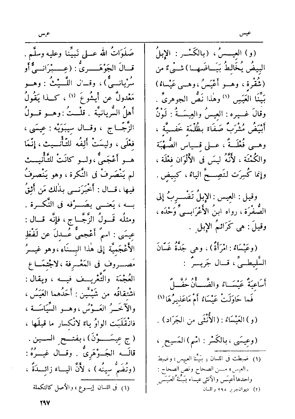 (و) {العَيْسَاءُ: الأُنْثَى من الجَرَاد.} وعِيسَى، بالكَسْر: اسْم المَسيح، صَلَوَاتُ الله على نَبيِّنا وَعَلِيهِ وسلَّم. قَالَ الجَوْهَرِيُّ: عِبْرَانيٌّ أَو سُرْيانٌّ، وَقَالَ اللَّيْثُ: وَهُوَ مَعْدُلٌ عَن أَيْشُوعَ، كَذَا يَقُولُ أَهْلُ السُّرْيانيَّة. قلْتُ: وَهُوَ قولُ الزَّجّاج، وَقَالَ سِيبَوَيْه: {عِيسَى، فِعْلَى، وليسَتْ أَلِفُه للتَّأْنيث، إِنّمَا هُوَ أَعْجَميٌّ، وَلَو كانَتْ للتَّأْنِث لم يَنْصَرفْ فِي النَّكْرة، وَهُوَ يَنْصَرفُ فِيهَا، قَالَ: أَخْبَرَني بذلك مَن أَثِقُ بِهِ، يَعني بصَرْفه فِي النّكرة. ومثلُه قَولُ الزَّجّاج، فإِنَّه قَالَ: عِيسَى: اسمٌ أَعْجَميٌّ عُدِلَ عَن لَفْظِ الأَعْجَمِيُّة إِلى هَذَا البِناءِ، وَهُوَ غيرُ مَصْوفٍ فِي المَعْرِفة، لاجْتِمَاع العُجْمَة والتَّعْريف فِيهِ، وَيُقَال: اشْتِقاقُه من شَيْئَين: أَحَدُهما} العَيْسُ، والآخَرُ العَوْس، وَهُوَ السِّيَاسَة، فانْ قَلَبَت الواوُ يَاء لانْكِسار مَا قَبْلَها، الجَوْهَرِيّ! عِيسَوْنَ، بفتحِ السِّين. قالَه الجَوْهَرِيُّ. وَقَالَ غيرُهُ: وتُضَمُّ سِينُه، لأَنَّ الياءَ زائِدةٌ