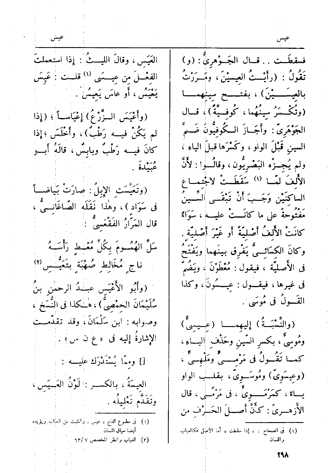 فسقطَت. . قَالَ الجَوْهَرِيُّ: وتَقُولُ: رأَيْتُ {العِيسَيْنَ، ومَرَرْتُ} بالعِيسَيْنَ، بفتحِ سِينِهما وتُكْسَرُ سِينُهُما، كُوفِيَّةٌ، قَالَ الجَوْهَرِيّ: وأَجَازَ الكُوفِيُّونَ ضَمَّ السينِ قَبْلَ الْوَاو، وكَسْرَها قبلَ الياءِ، وَلم يُجِزْه البَصْرِيُّون، وقالُوا: لأَنَّ الأَلِفَ لمّا سَقَطَتْ لاجْتِمَاعِ الساكِنين وَجَبَ أَنْ تَبْقَى السِّينُ مَفْتُوحةً على مَا كانَتْ عَلَيْهِ، سَوَاءٌ كانَتْ الأَلِفُ أَصْلِيّةً أَو غَيْرَ أَصْلِيّةٍ وكانَ الكِسَائِيُّ يَفْرِق بينَهما ويَفْتَحُ فِي الأَصْليّة، فَيَقُول: مُعْطَوْنَ، ويَضُمُّ فِي غَيرهَا، فَيَقُول: {عِيسُونَ، وَكَذَا القَولُ فِي مُوسَى. والنِّسْبَةُ إِليهِما} - عِيسِيٌّ ومُوسِيٌّ، بكسرِ السّينِ وحَذْفِ الياءِ، كَمَا تَقُولُ فِي) مَرْمِيٍّ ومَلْهِيٍّ، {- وعِيسَوِيّ ومُوسَوِيّ، بقلب الْوَاو يَاء، كمَرْمَوِيٍّ، فِي مَرْمىً، قَالَ الأَزْهَرِيُّ: كانَّ أَصْلَ الحَرْفِ من} العَيَس، وقالَ الليثُ: إِذا اسْتعملتَ الفِعْلَ مِن {عِيسَى قلت:} عَيِسَ {يَعْيَسُ، أَو} عاسَ {يَعِيسُ.} وأَعْيَسَ الزَّرْعُ {إِعْيَاساً، إِذا لم يَكُنْ فِيهِ رَطْبٌ، وأَخْلَسَ، إِذا كانَ فِيهِ رَطْبٌ ويابِسٌ، قالَهُ أَبو عُبَيْدةَ.} وتَعَيَّسَتِ الإِبِلُ صارَتْ بَياضاً فِي سَوَادٍ، وَهَذَا نَقَلَه الصّاغَانِيُّ، قَالَ المَرّارُ الفَقْعَسِيُّ: