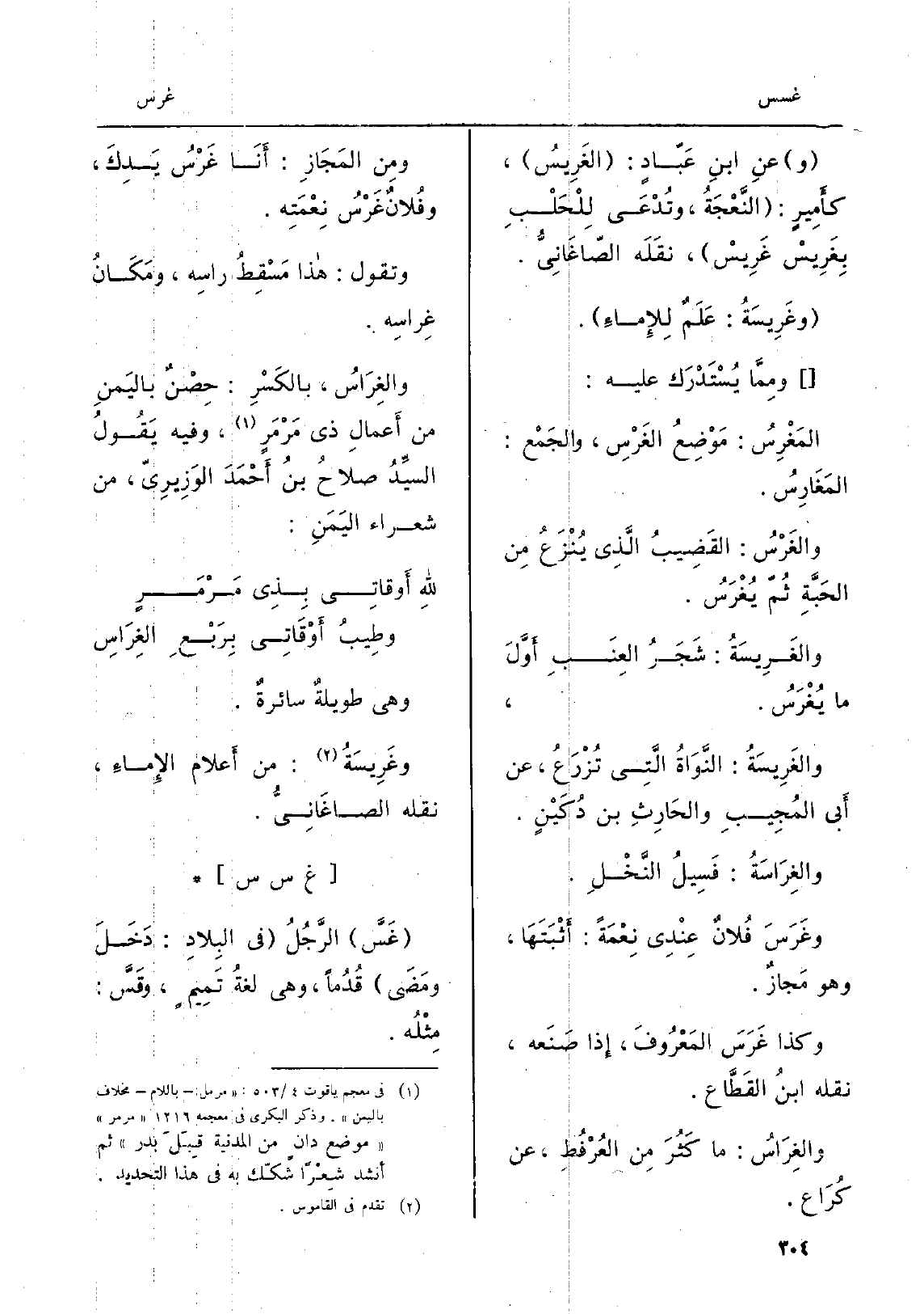 عَن ابنِ عَبّادٍ. والغَرِيسَةُ: النَّخْلَةُ أَوَّلَ مَا تَنْبُتُ، كالوَلِيدَةِ للصَّبِيَّةِ الحَدِيثَةِ العَهْدِ بالوِلادَةِ، أَو الفَسِيلَةُ ساعَةَ تُوضَعُ فِي الأَرْضِ حتَّى تَعْلَقَ، عَن ابنِ دُرَيْدٍ، والجَمْعُ: غَرَائِسُ وغِرَاسٌ، الأَخِيرَةُ نادِرَةٌ. وعنِ ابنِ عَبَّادٍ: الغَرِيسُ، كأَمِيرٍ: النَّعْجَةُ، وتُدْعَى لِلْحَلْبِ بِغَرِيسْ غَرِيسْ، نقَلَه الصّاغَانِيُّ. وغَرِيسَةُ: عَلَمٌ للإِماءِ. ومِمَّا يُسْتَدْرَكُ عَلَيْهِ: المَغْرِسُ:) مَوْضِعُ الغَرْسِ، والجَمْع: المَغَارِسُ. والغَرْسُ: القَضِيبُ الذَّي يُنْزَعُ مِن الحَبَّةِ ثُمّ يُغْرَسُ.