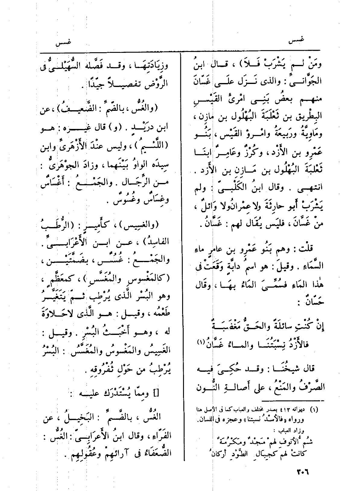 ومَنْ لم يَشْرَبْ فَلاَ، قَالَ ابنُ الجَوَّانيِّ: وَالَّذِي نَزَل عَلَى غَسّانَ مِنْهُم بعضُ بَنِي امْرئِ القَيْسِ البِطْريق بن ثَعلَبَةَ البُهْلُول بن مازِن، ومَاوِيَّةُ ورَبِيعَةُ وامْرؤُ القَيْس، بَنُو عَمْرِو بن الأَزْد، وكُرْزٌ وعَامِرٌ ابنَا ثَعْلَبَةَ البُهْلُول بن مَازِنِ بن الأَزد. انْتهى. وَقَالَ ابنُ الكَلْبِيّ: وَلم يَشْرَبْ أَبو حارِثَةَ وَلَا عِمْرانُ وَلَا وَائِلٌ، منْ غَسَّانَ، فليسَ يُقَال لَهُم: غَسَّانُ.