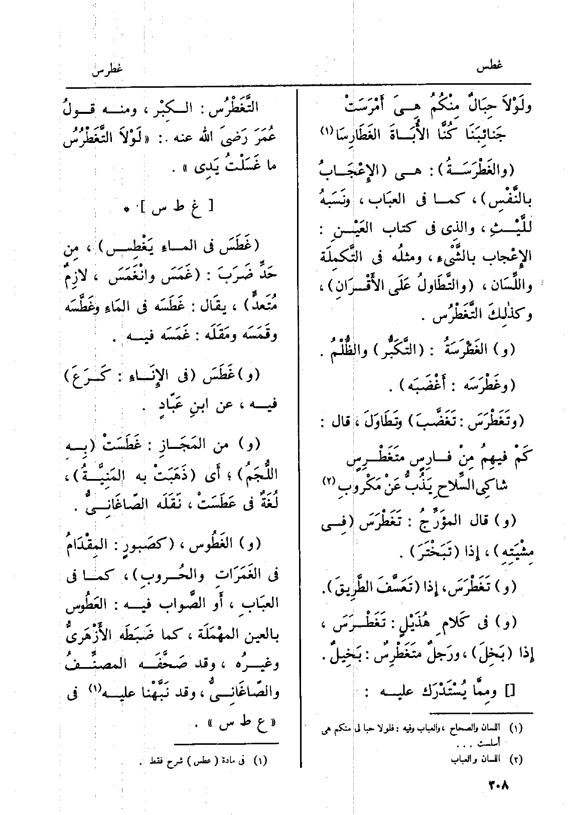 وَقَالَ المؤَرِّجُ: تَغَطْرَسَ فِي مِشْيَتِهِ، إِذا تَبَخْتَرَ. وتَغَطْرَسَ، إِذا تَعَسّفَ الطَّرِيقَ. وَفِي كَلامِ هُذَيْلٍ: تَغَطْرَسَ، إِذا بَخِلَ، ورَجلٌ متَغَطْرِسٌ: بَخِيلٌ. ومِمَّا يُسْتَدْرَك عَلَيْهِ: التَّغَطْرُس: الكِبْر، وَمِنْه قولُ عُمَرَ رَضيَ الله عَنهُ: لَوْلاَ التَّغَطْرُسُ مَا غَسَلْتُِ يَدِي.
