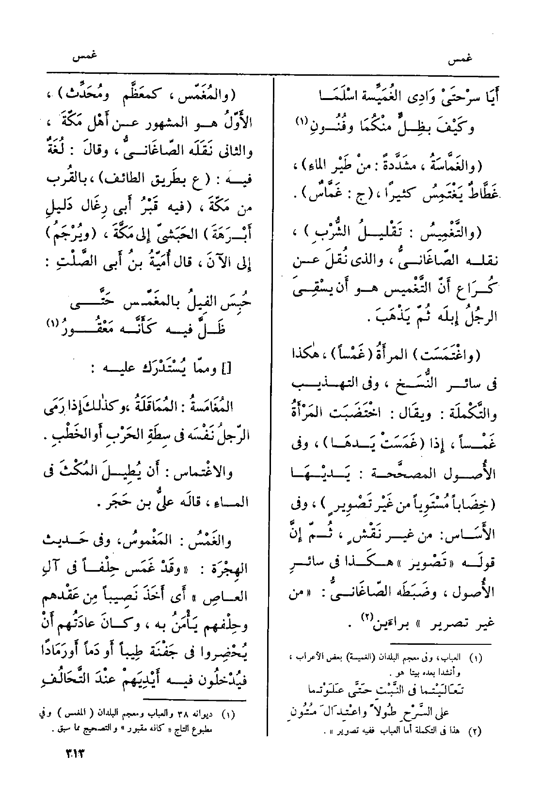 واغْتَمَسَت المرأَةُ غَمْساً، هَكَذَا فِي سائِر النُّسَخ، وَفِي التَّهْذِيب والتَّكْملَة: ويقَال: اخْتَضَبَت المَرْأَةُ غَمْساً، إِذا غَمَسَتْ يَدهَا، وَفِي الأُصول المصحَّحة: يَديْهَا خِضَاباً مُسْتَوِياً من غَيْر تَصْوِيرٍ، وَفِي الأَسَاس: من غير نَقْشٍ، ثُمّ إِنَّ قولَه تَصْوِير هكَذا فِي سائِر الأُصول، وضَبَطَ الصّاغَانِيُّ: من غير تصرير براءَين. والمُغَمّس، كمعَظَّم ومُحَدِّث، الأَوّلُ هُوَ الْمَشْهُور عَن أَهْل مَكّةَ، وَالثَّانِي نَقَلَه الصّاغَانِيُّ، وقالَ: لُغَةٌ فِيهِ: ع بطَريق الطَّائِف، بالقُرب من مَكّةَ، فِيهِ قَبْرُ أَبي رِغَال دَليلِ أَبْرَهَةَ الحَبَشيّ إِلى مَكَّةَ، ويُرْجَمُ إِلى الآنَ، قَالَ أُمَيَّةَ بنُ أَبي الصَّلْتِ: